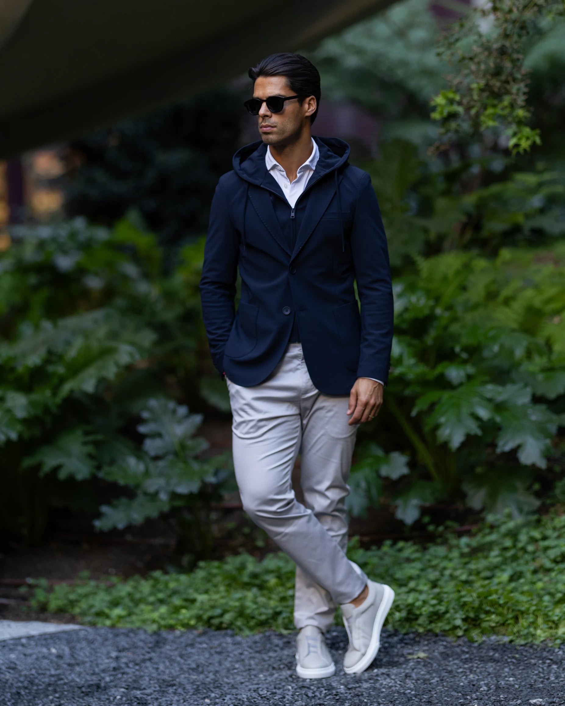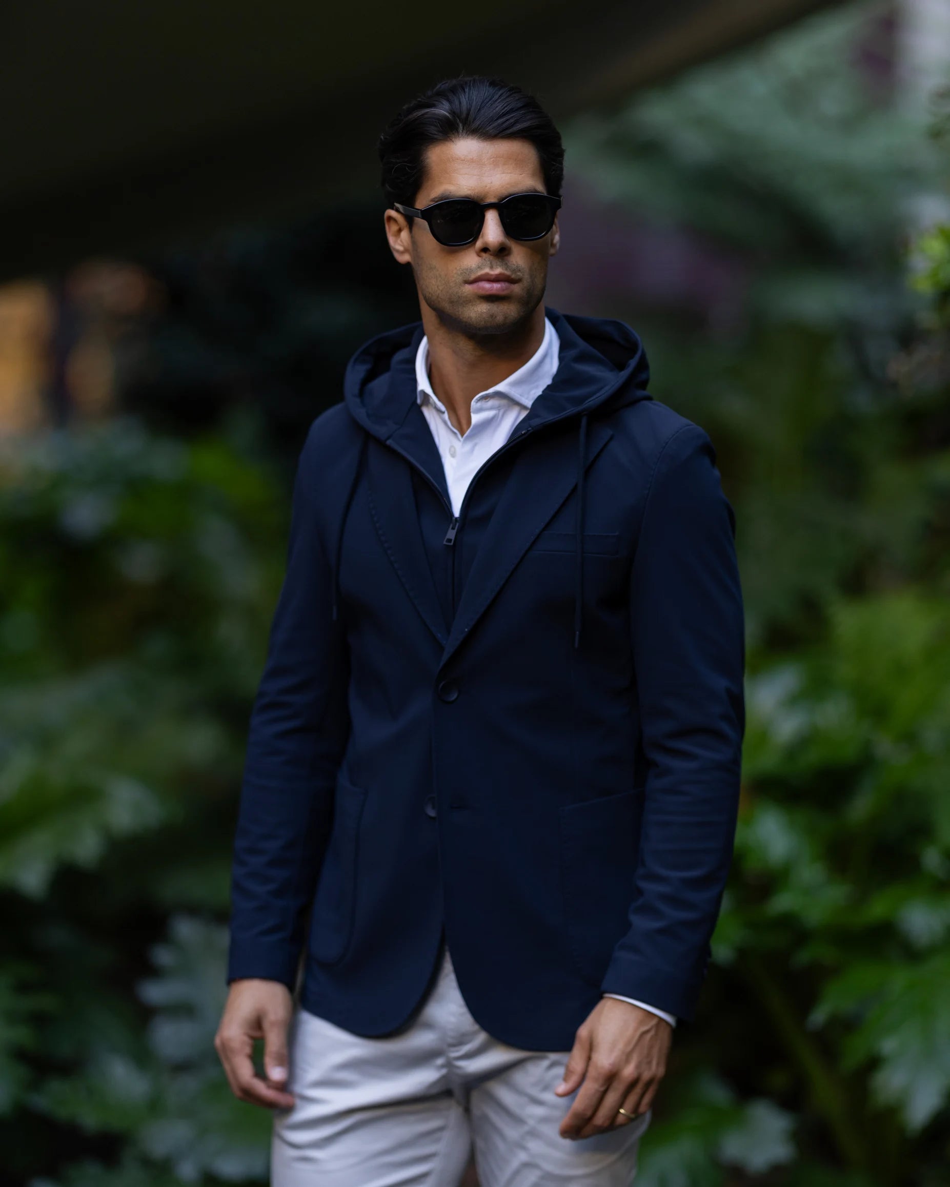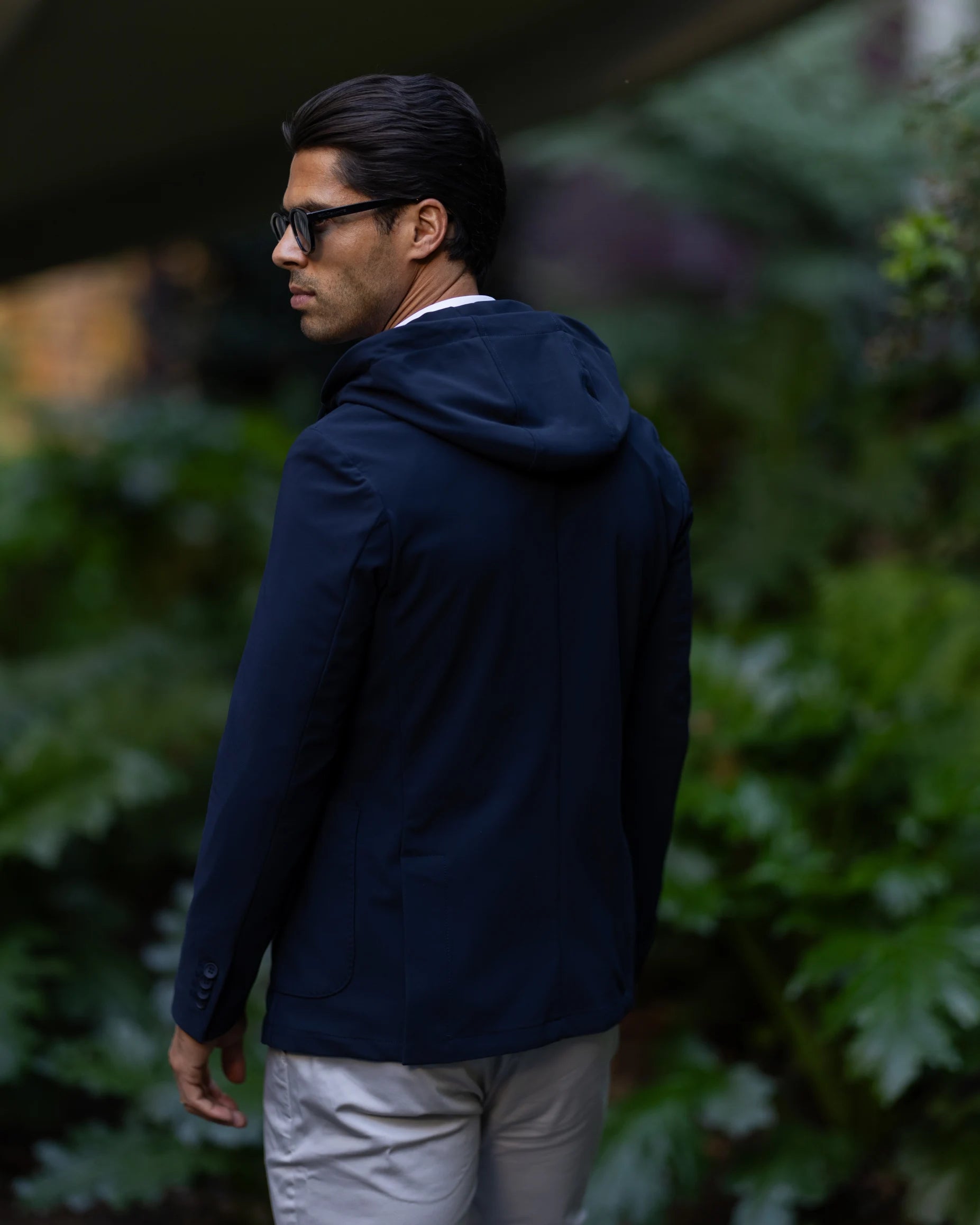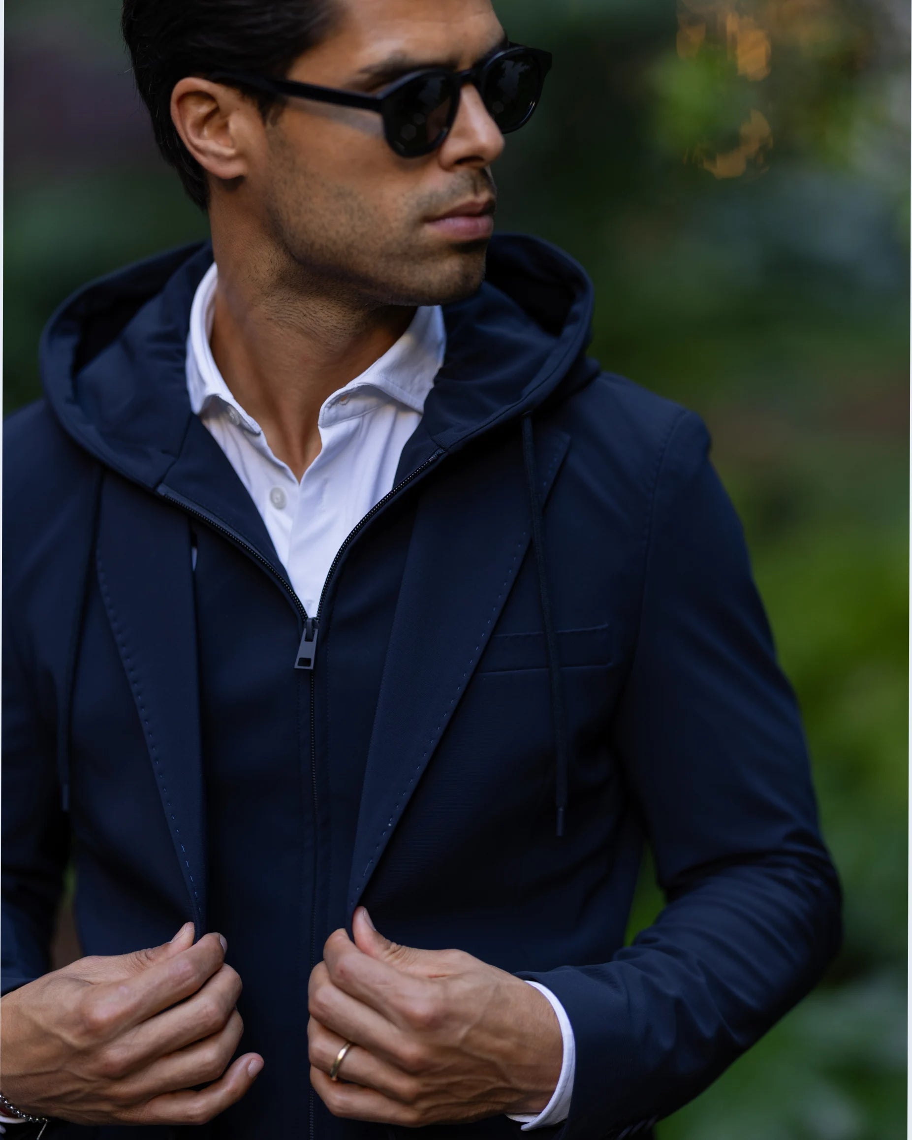 Com capuz removível, fecho interior e botões, bolsos exteriores e abertura traseira, esta peça combina versatilidade e sofisticação para qualquer ocasião.