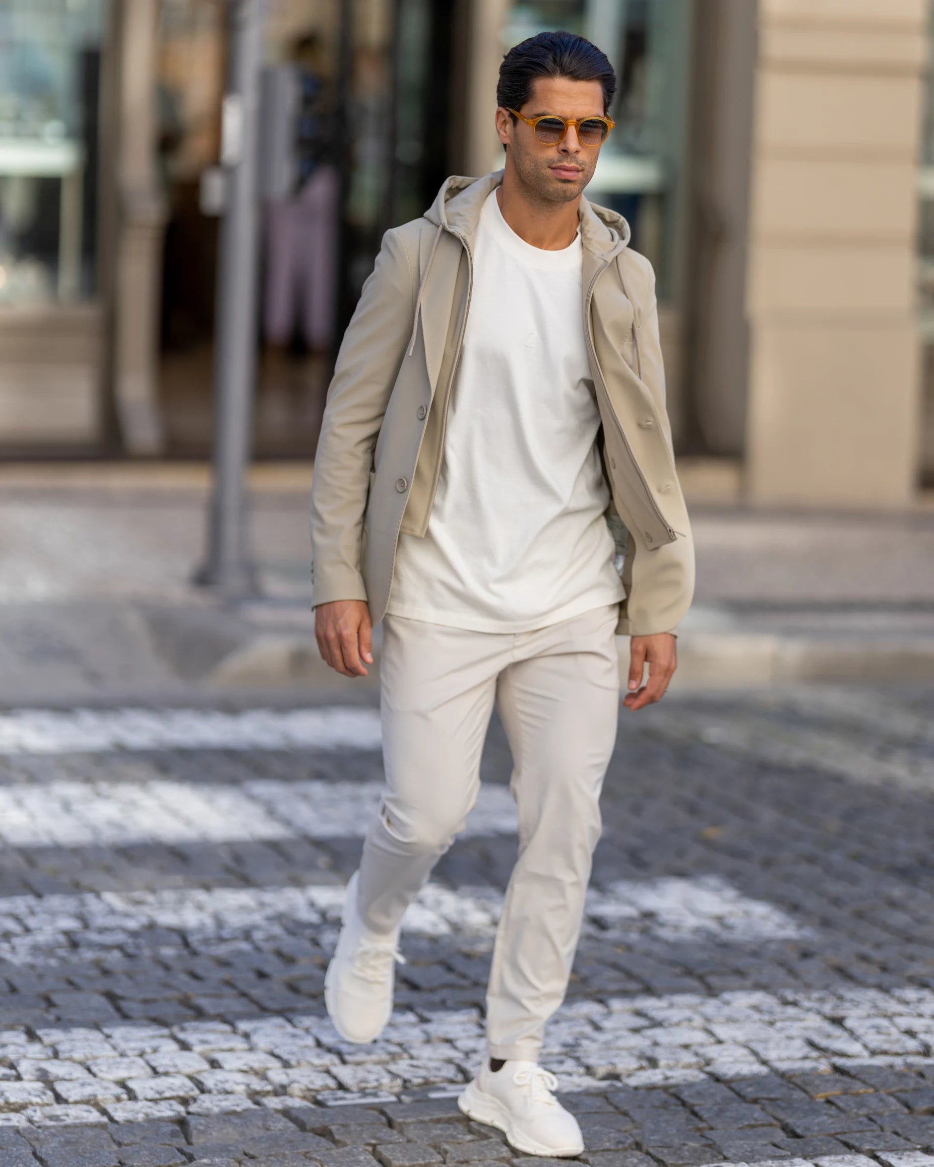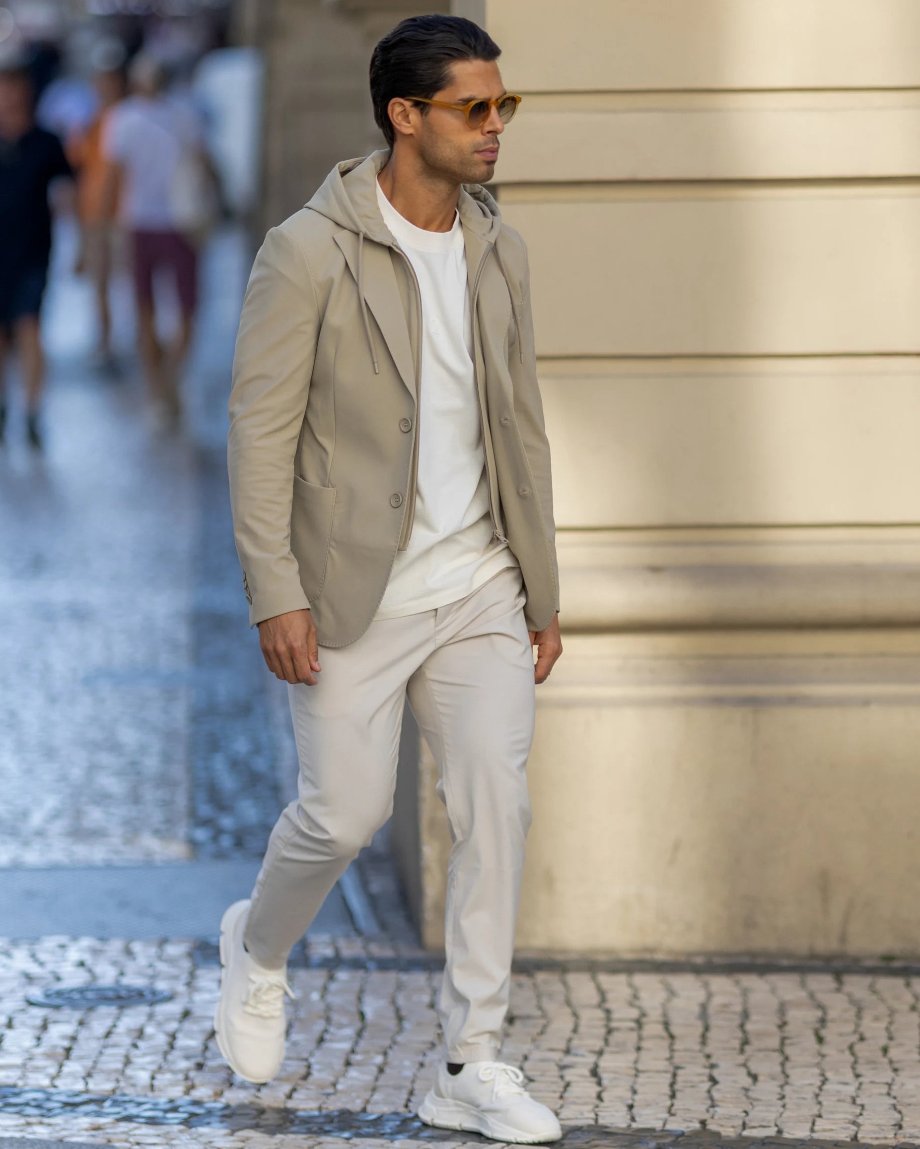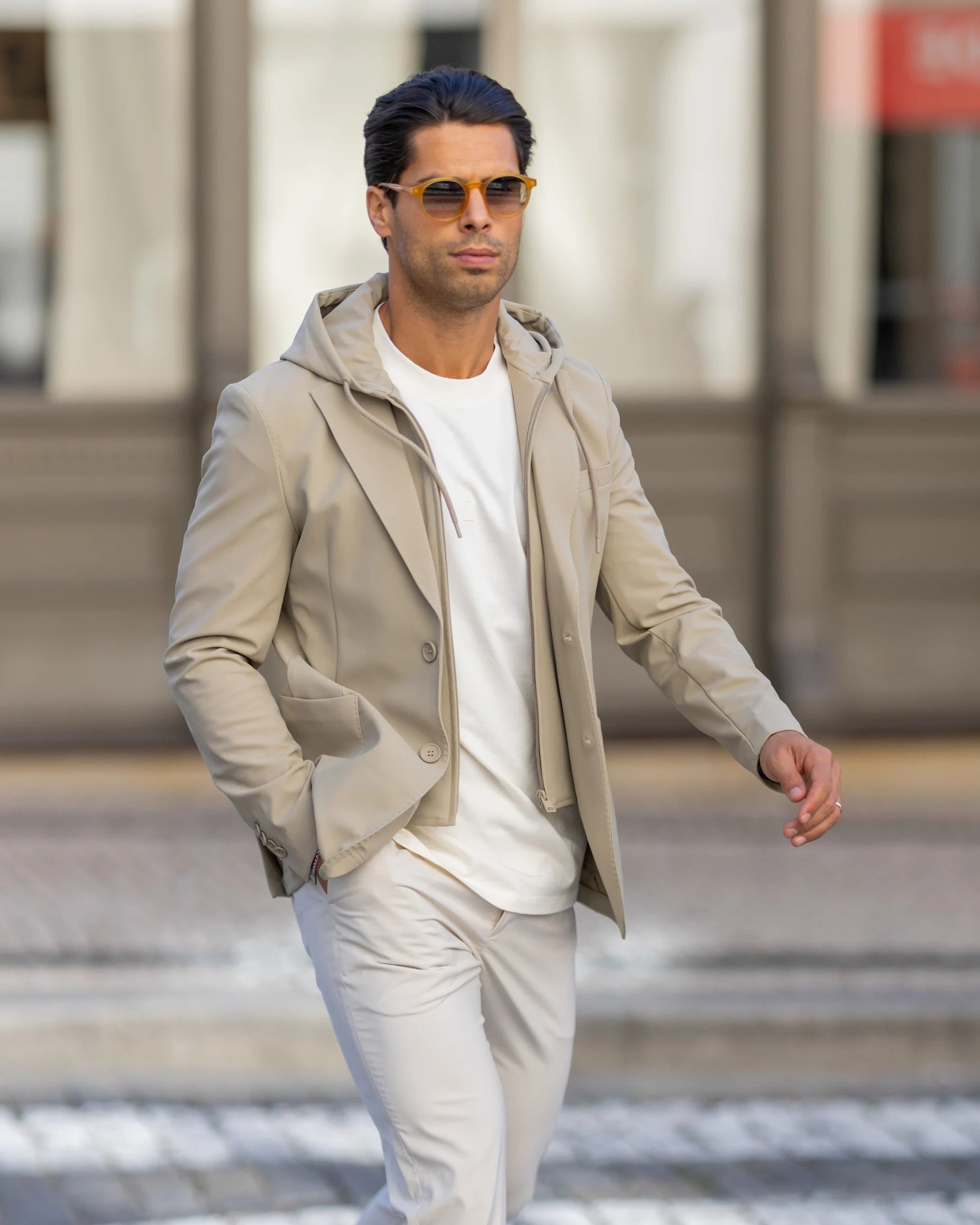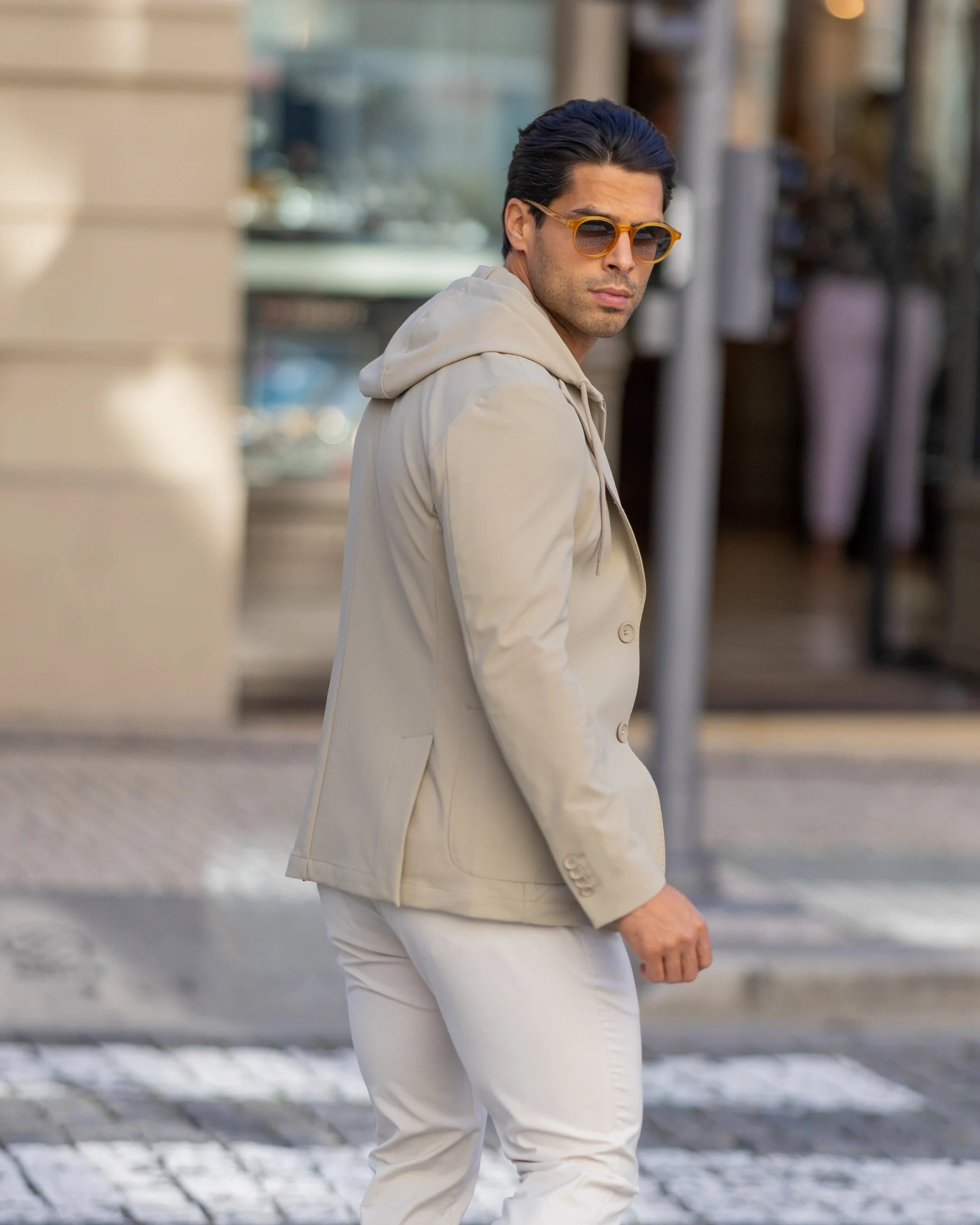 Com capuz removível, fecho interior e botões, bolsos exteriores e abertura traseira, esta peça combina versatilidade e sofisticação para qualquer ocasião.