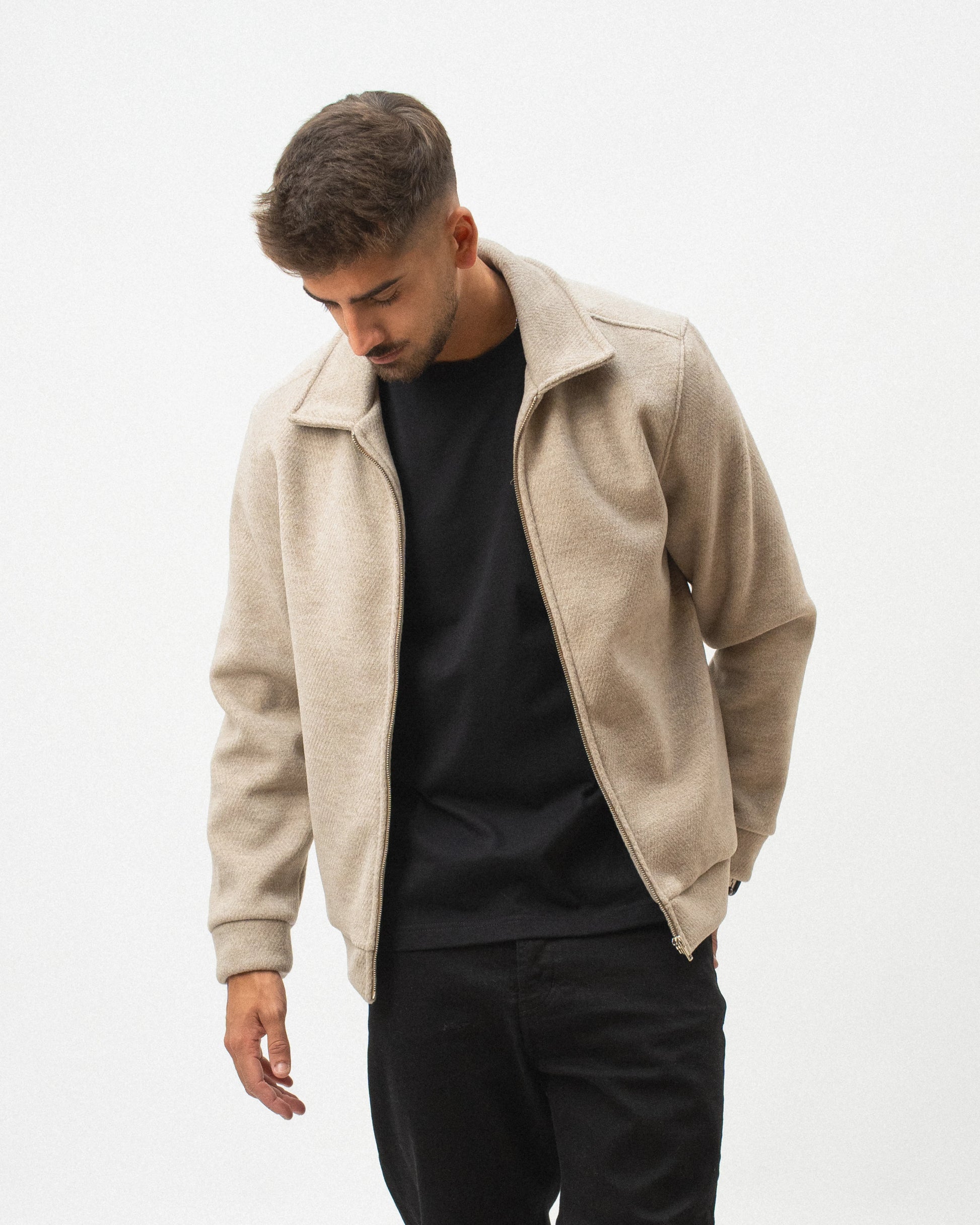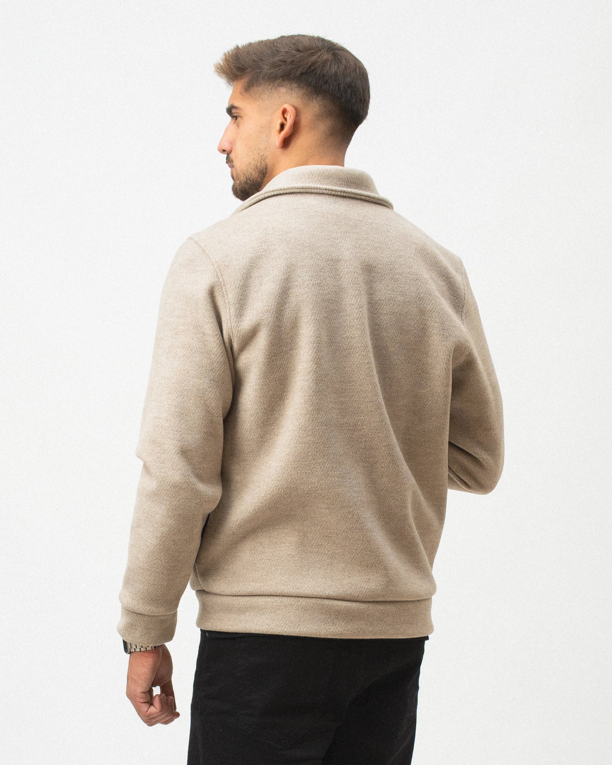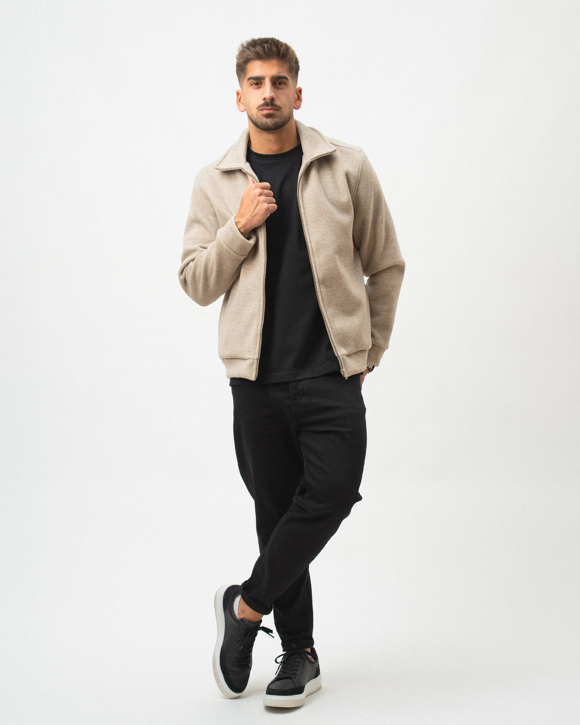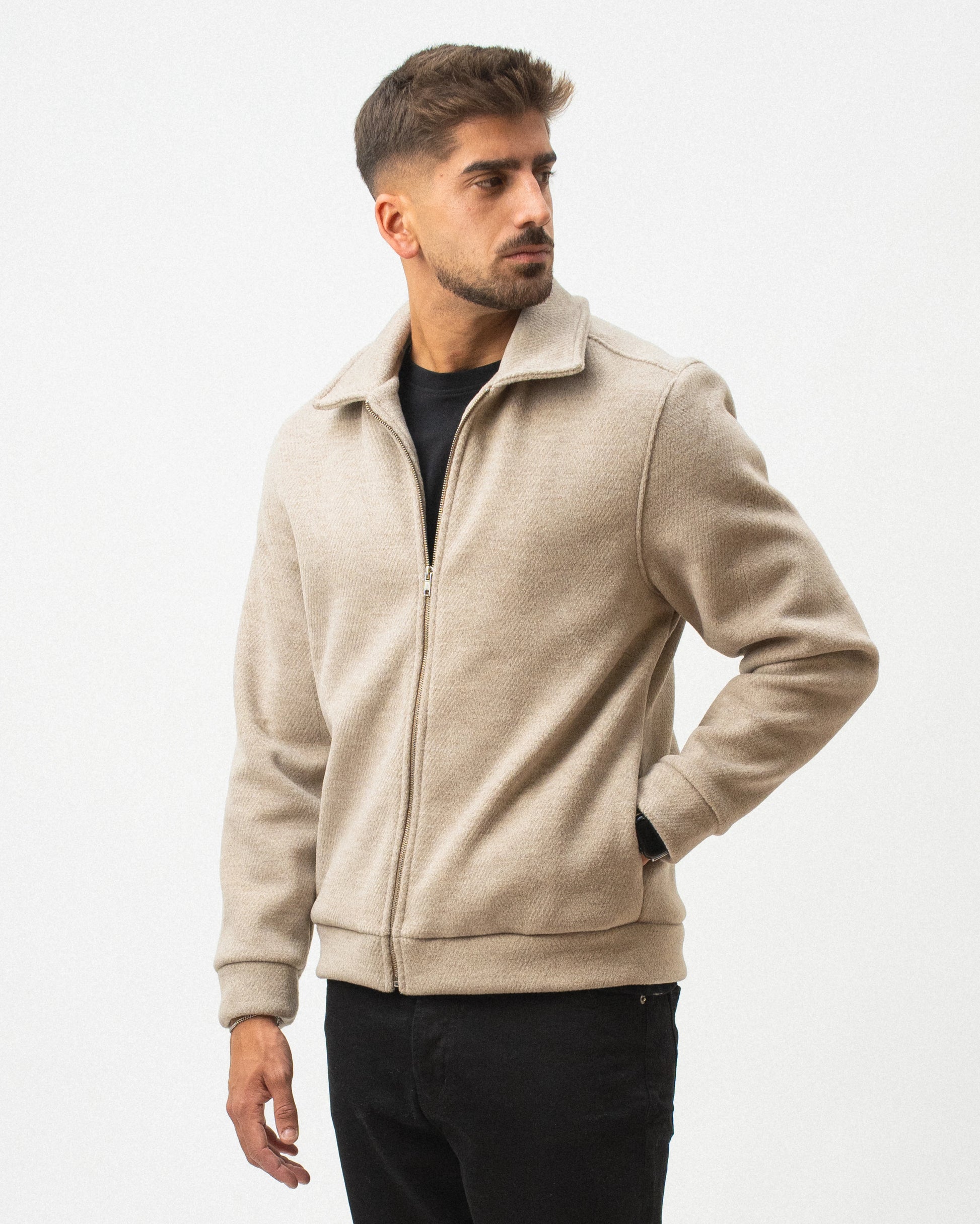 Corte regular. Gola de camisa. Manga comprida com punhos elásticos. Dois bolsos laterais. Fecho de correr à frente. Base elástica.