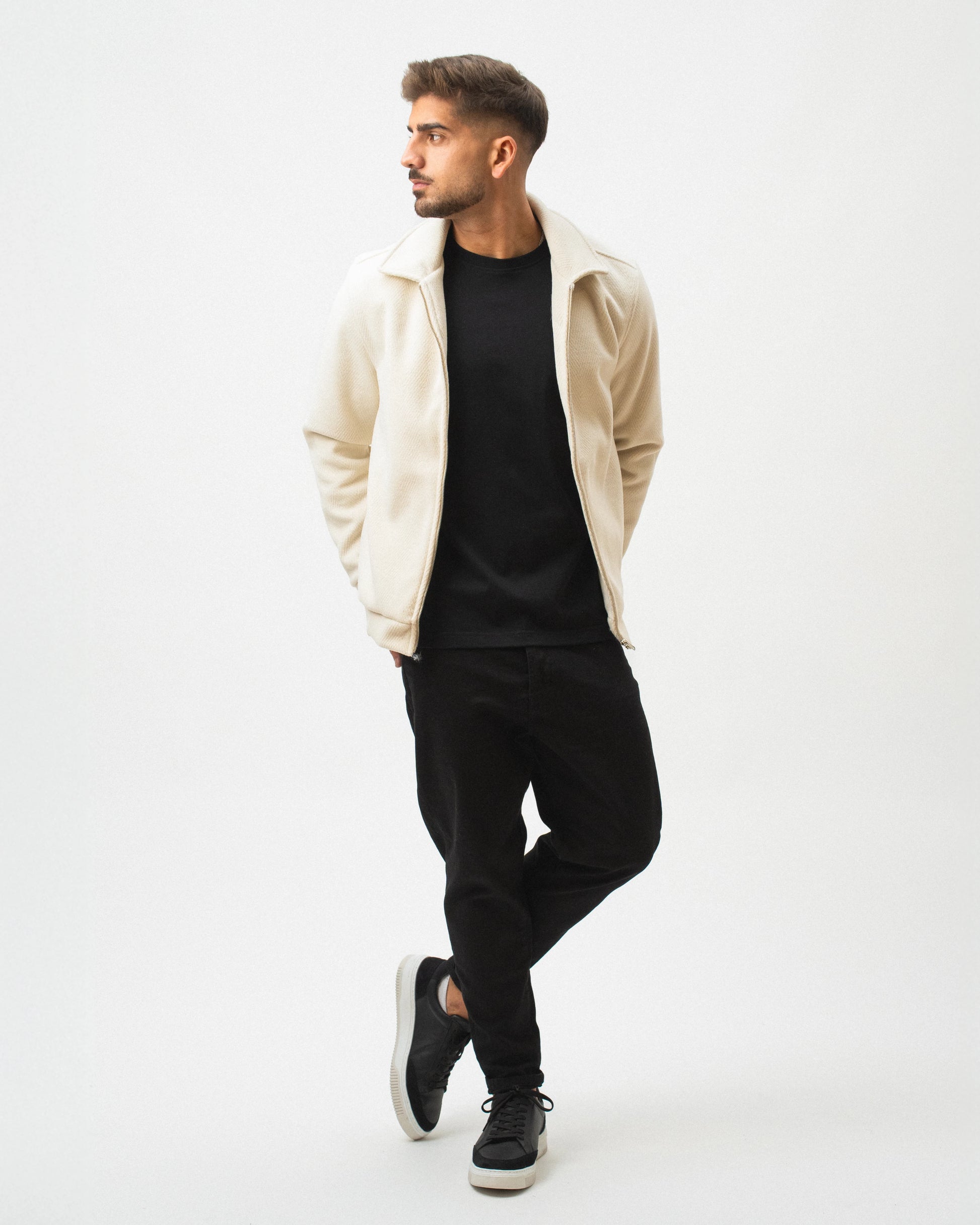 Corte regular. Gola de camisa. Manga comprida com punhos elásticos. Dois bolsos laterais. Fecho de correr à frente. Base elástica.