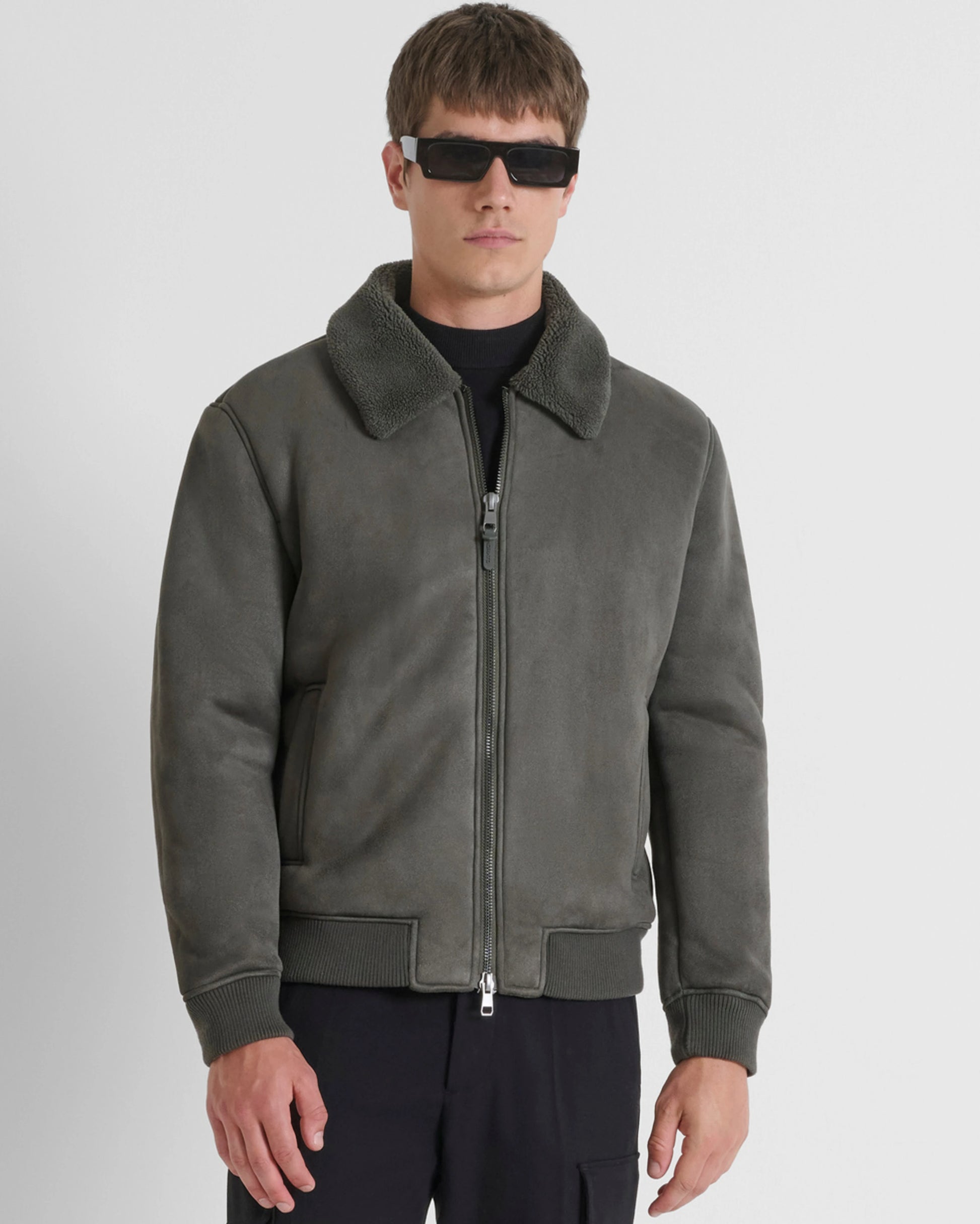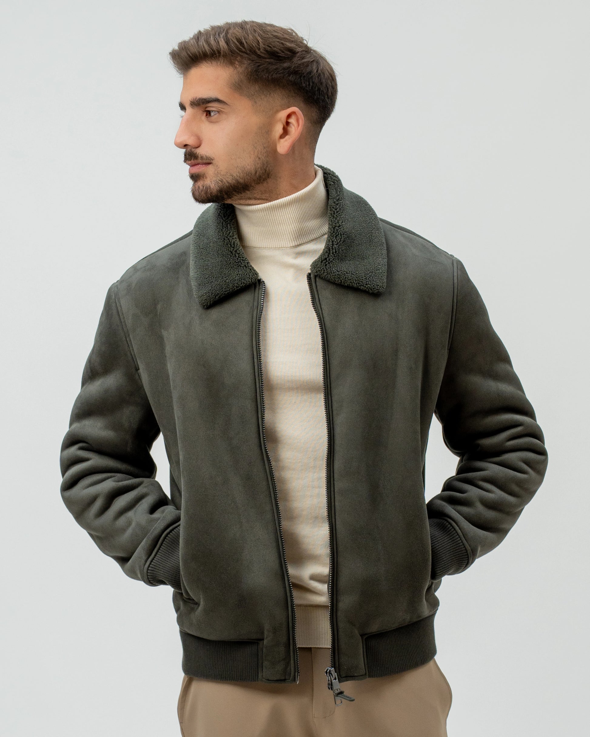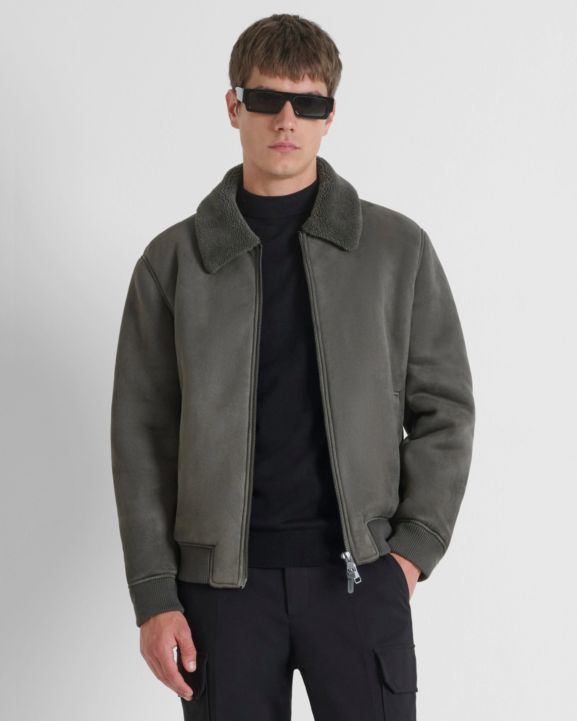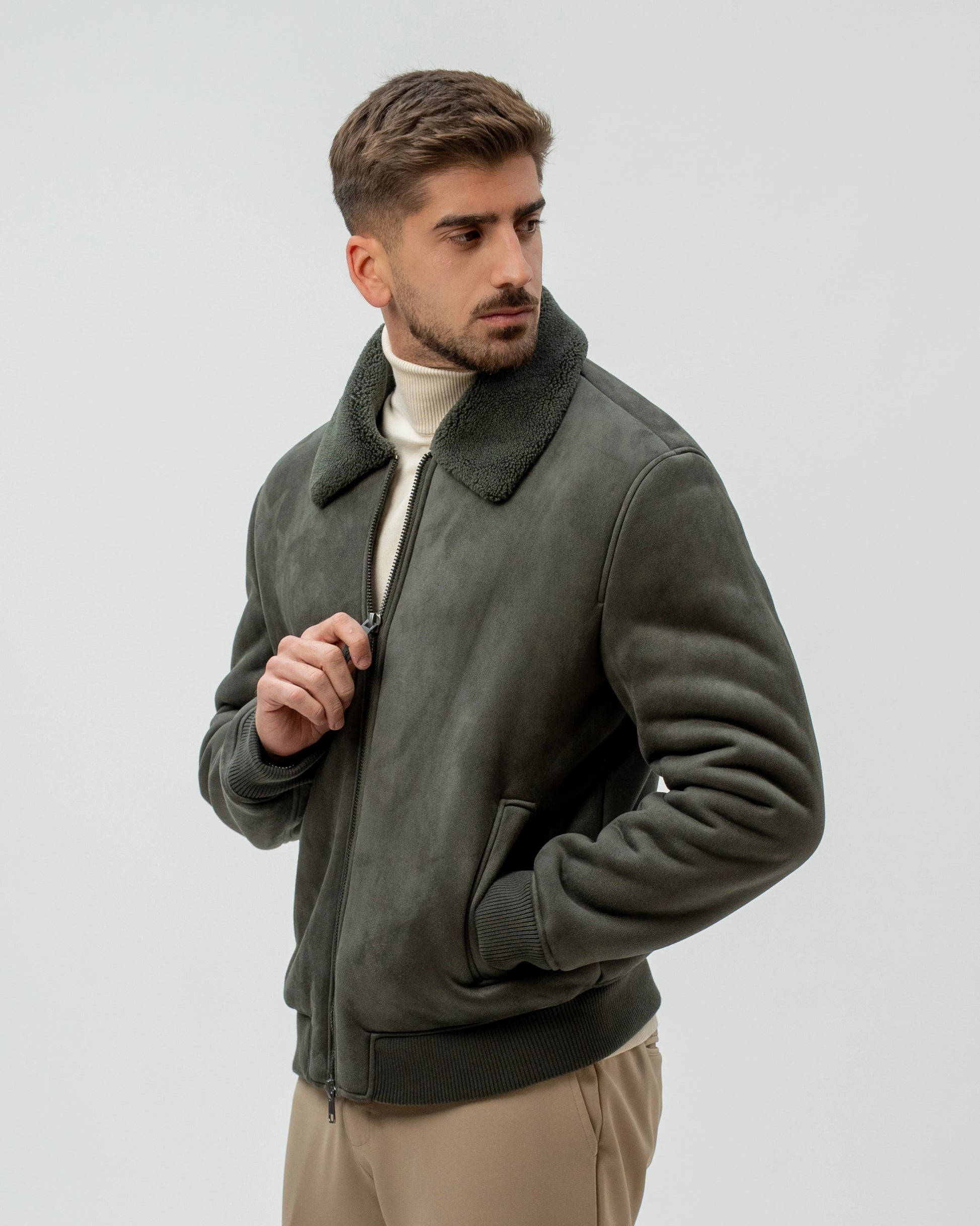 Casaco bomber de corte regular com gola e punhos em tecido macio. A peça é confecionada em tecido com efeito camurça, que confere um toque de elegância a este modelo desportivo. Fecho central com fecho e gancho emborrachado, dois bolsos frontais embutidos.