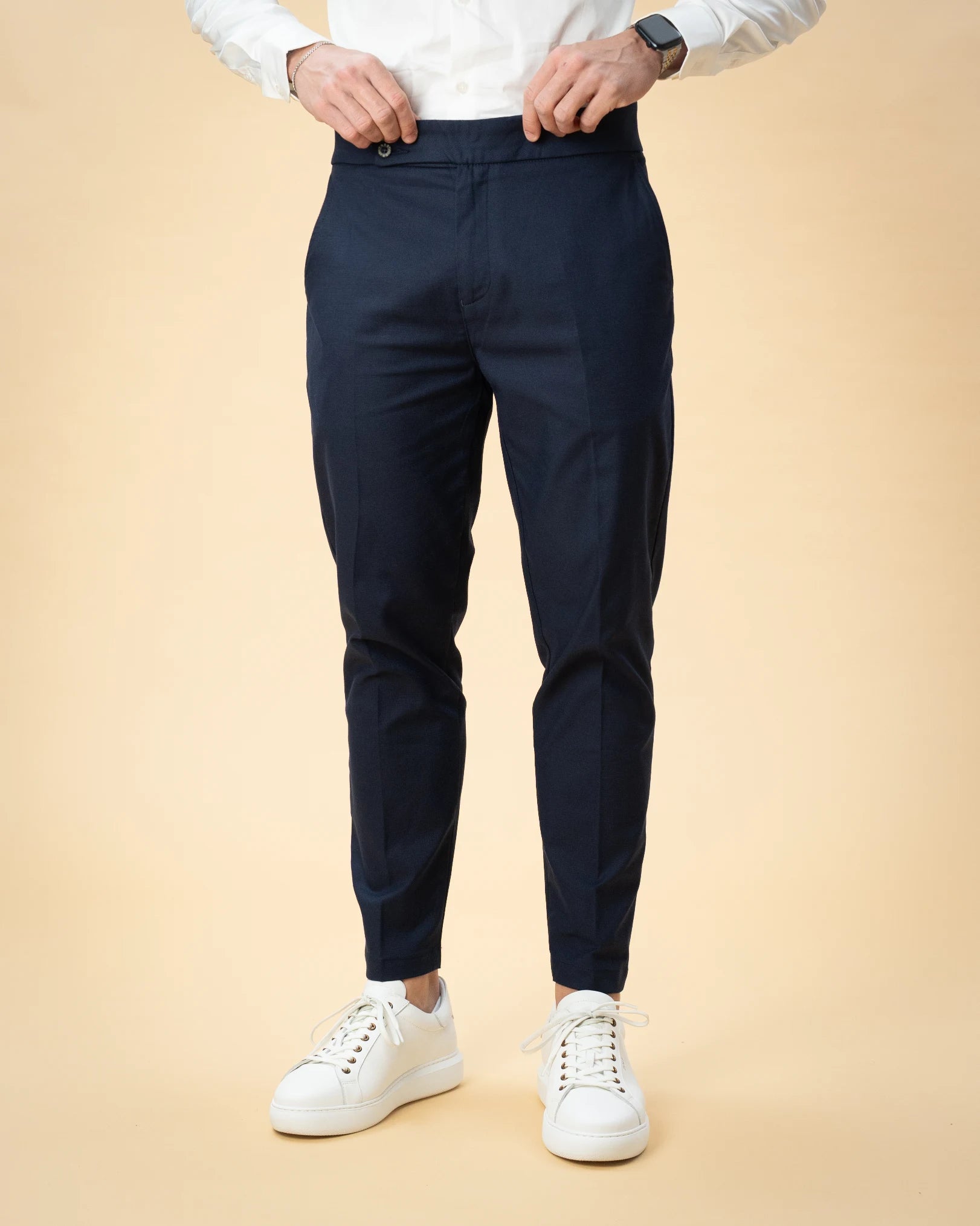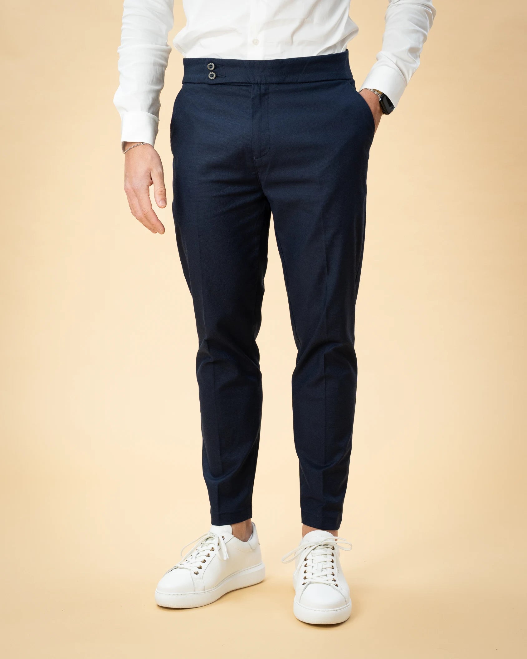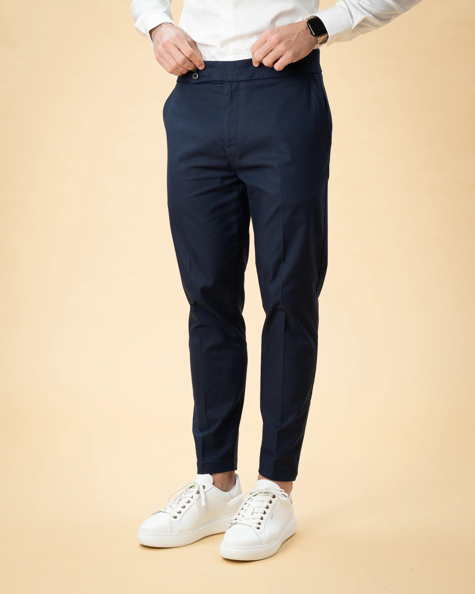 Design Distinto: Cós prolongado com fecho de dois botões laterais, dispensando o uso de cinto para um visual mais limpo e moderno.