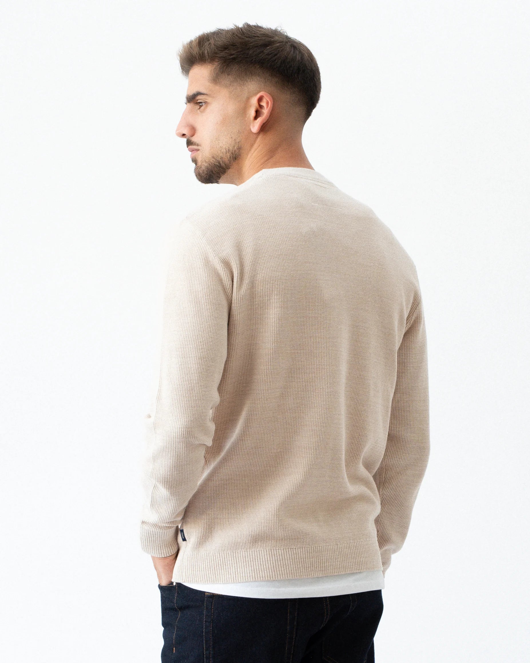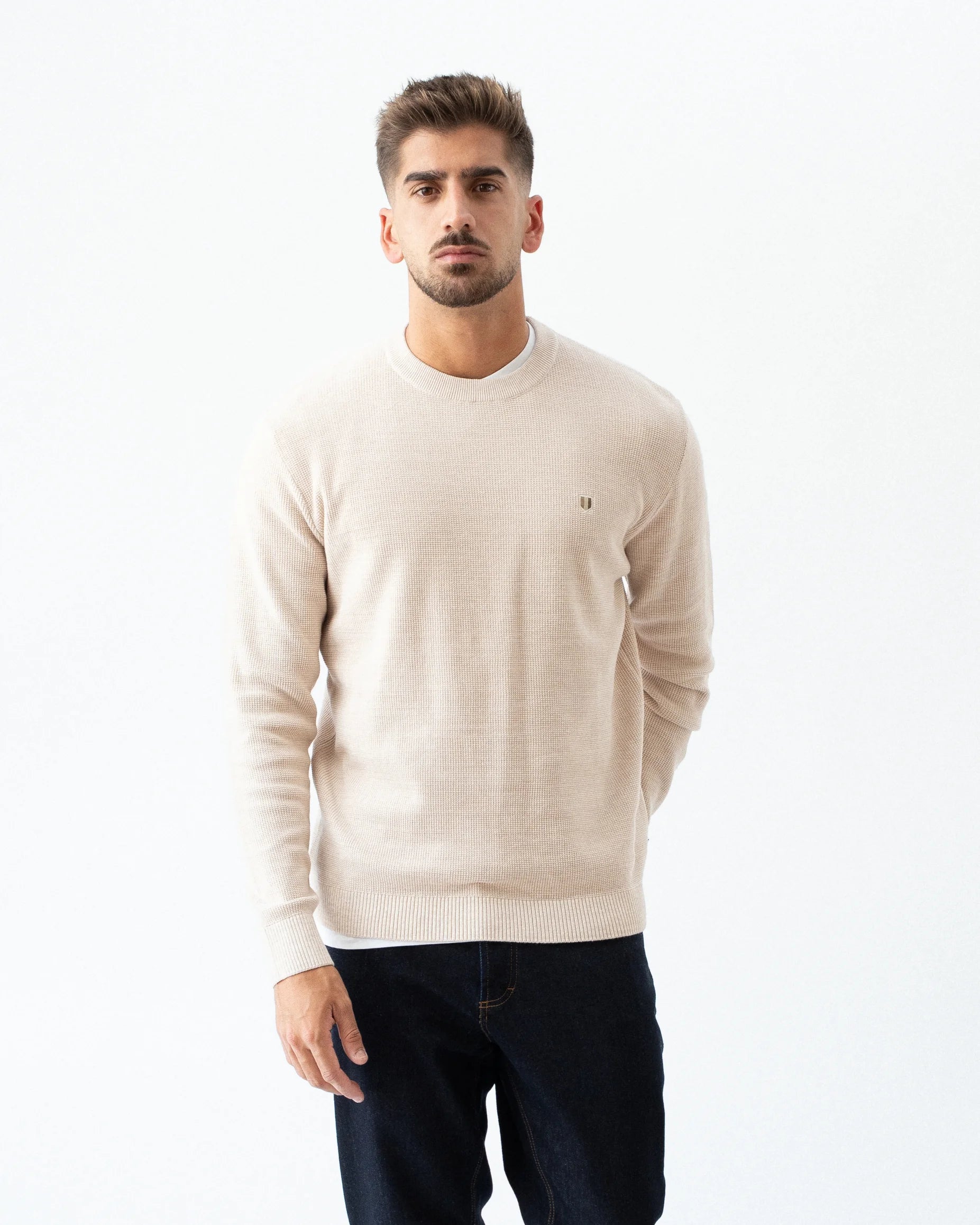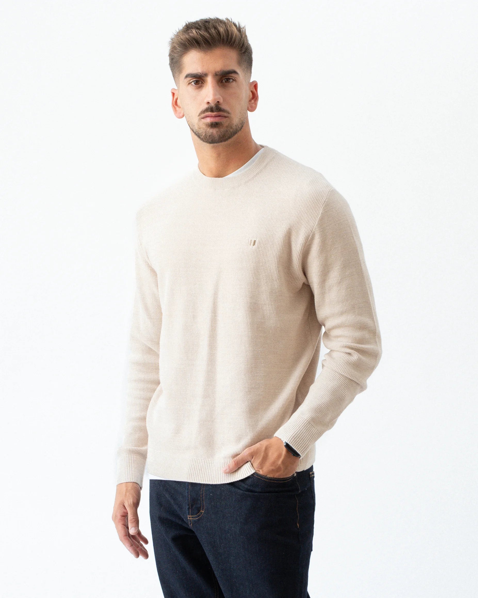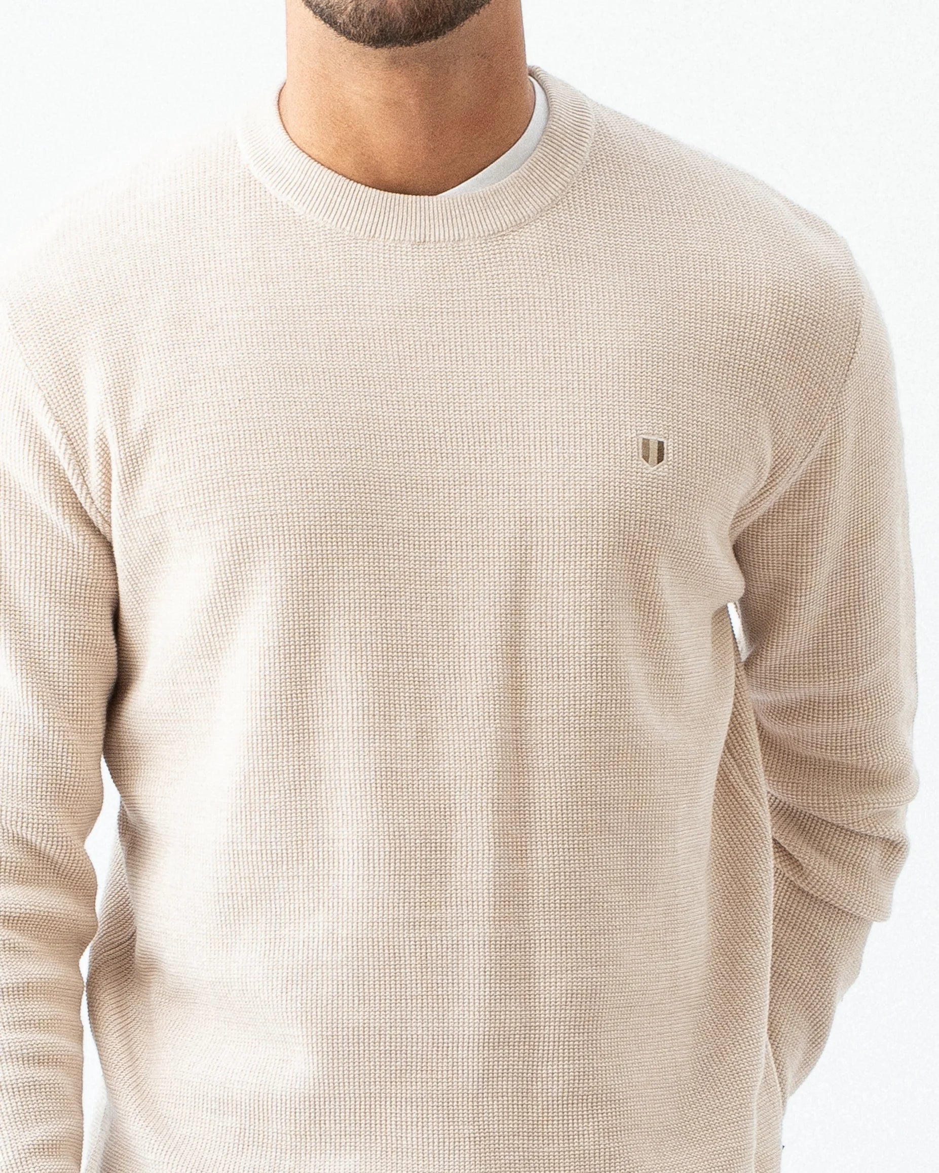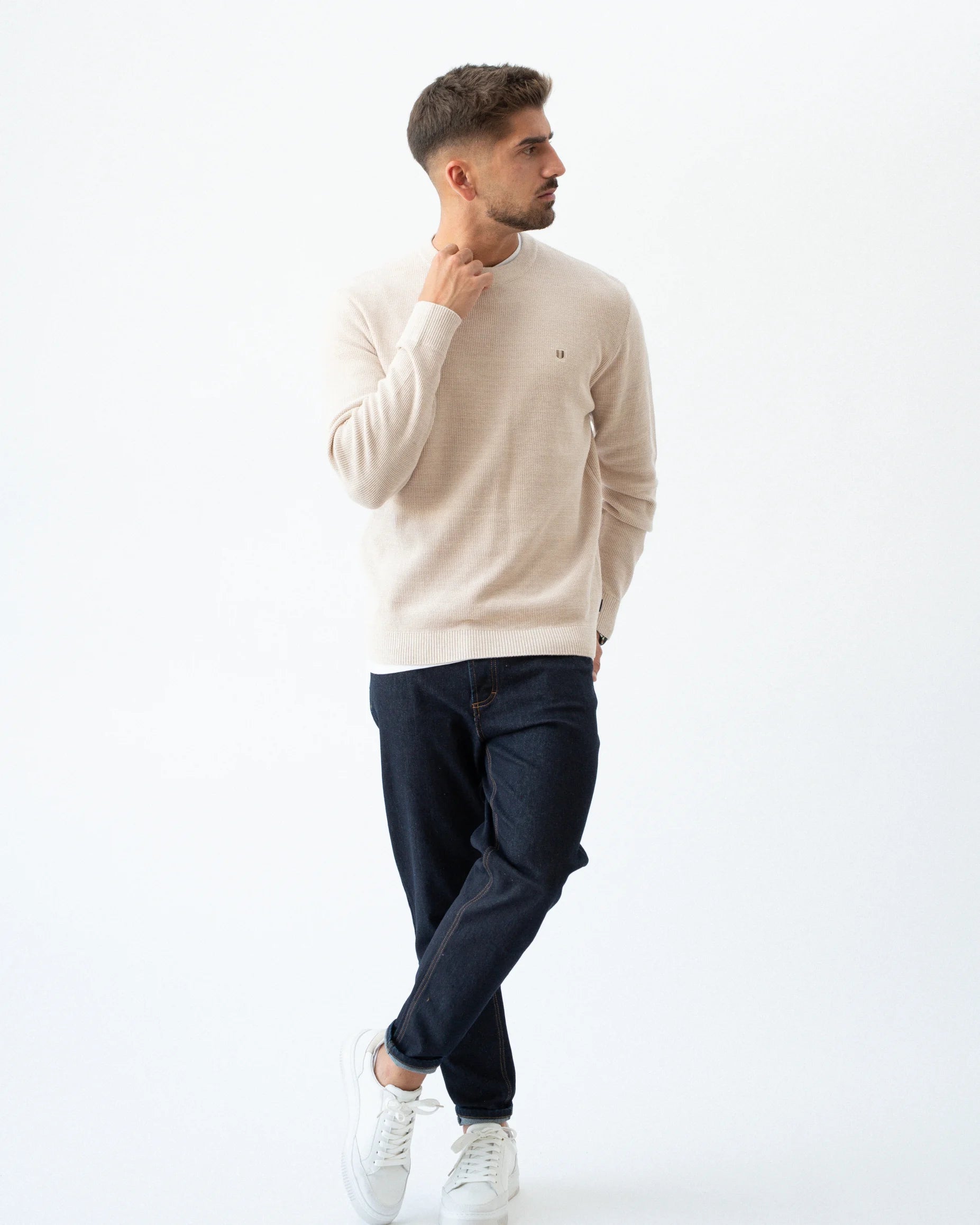 Camisola em malha de 100% algodão. Gola redonda e manga comprida