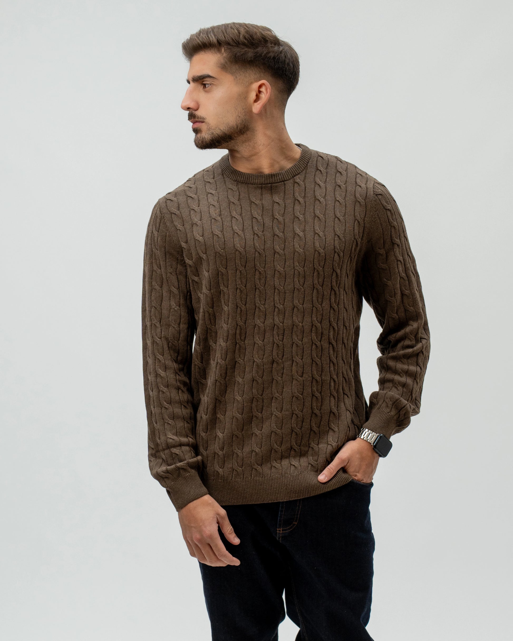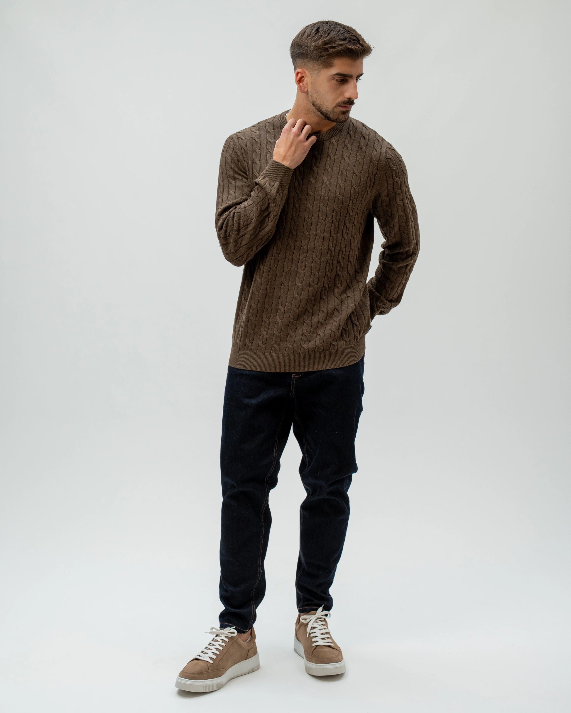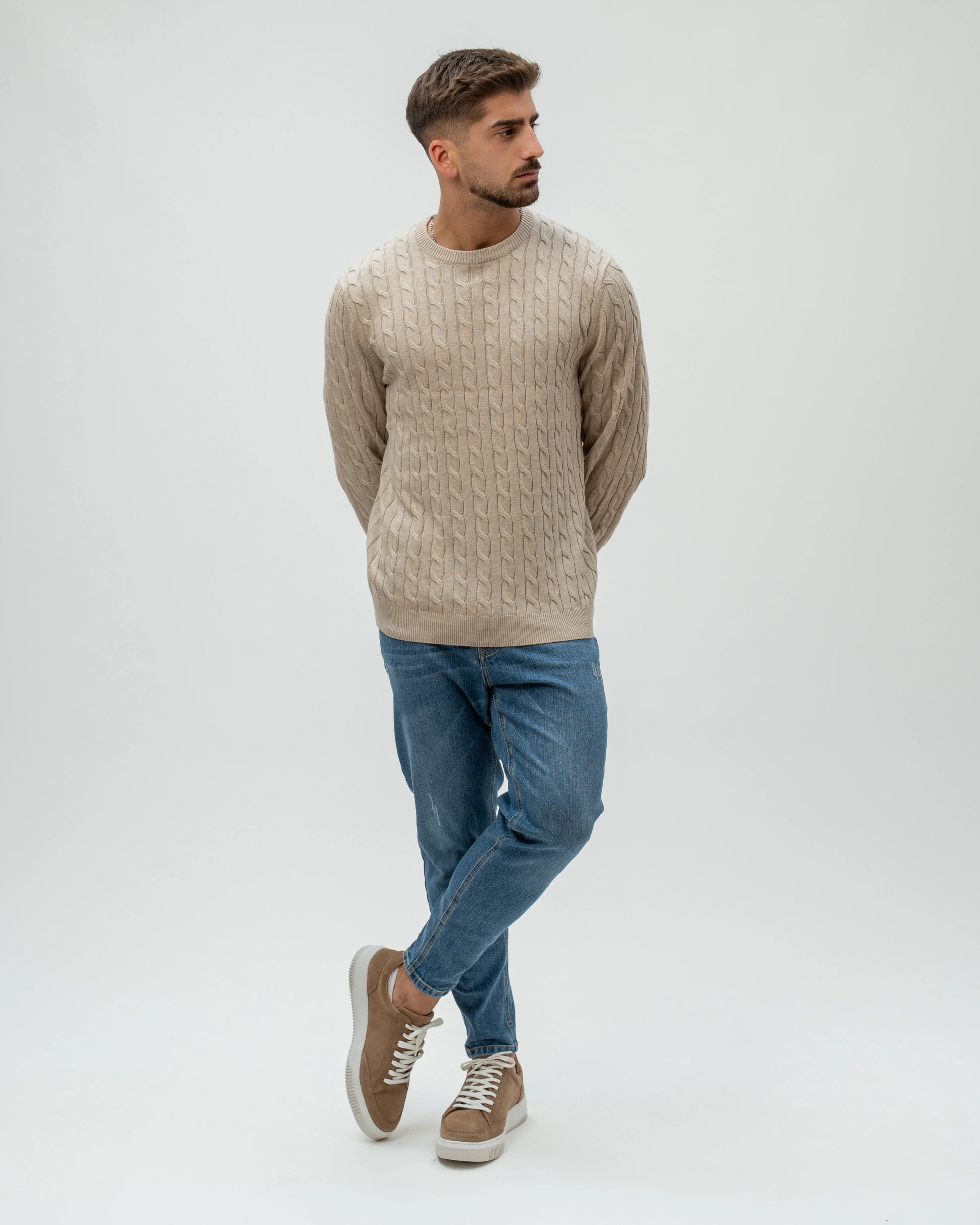 Uma peça que une o clássico padrão cable knit, ideal para o homem que procura um visual sofisticado e versátil, transitando facilmente entre o escritório e eventos casuais.