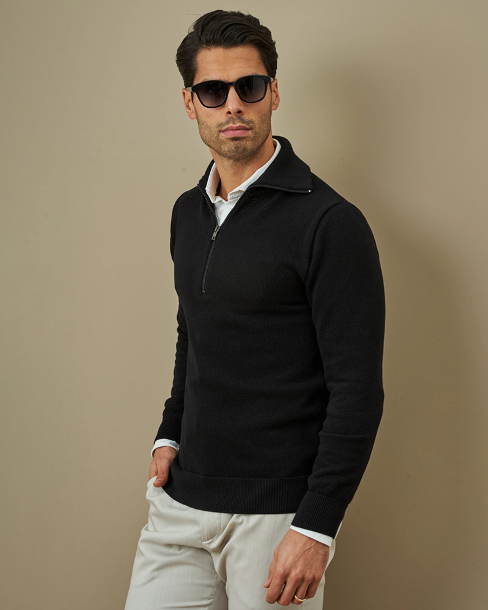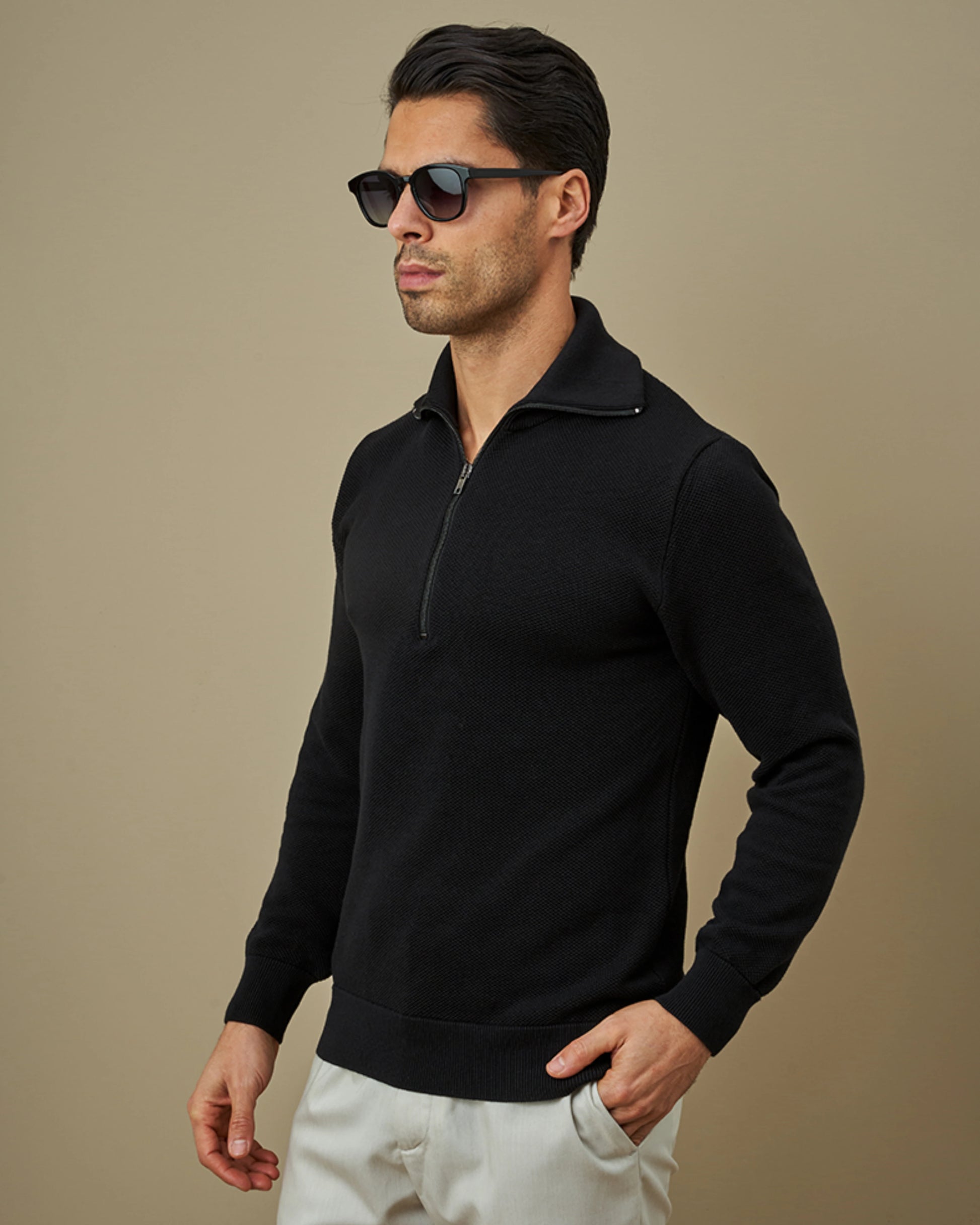 Camisola de tricot com gola e fecho, confortável e prática para o dia a dia. Um essencial versátil que combina estilo moderno com um toque descontraído.