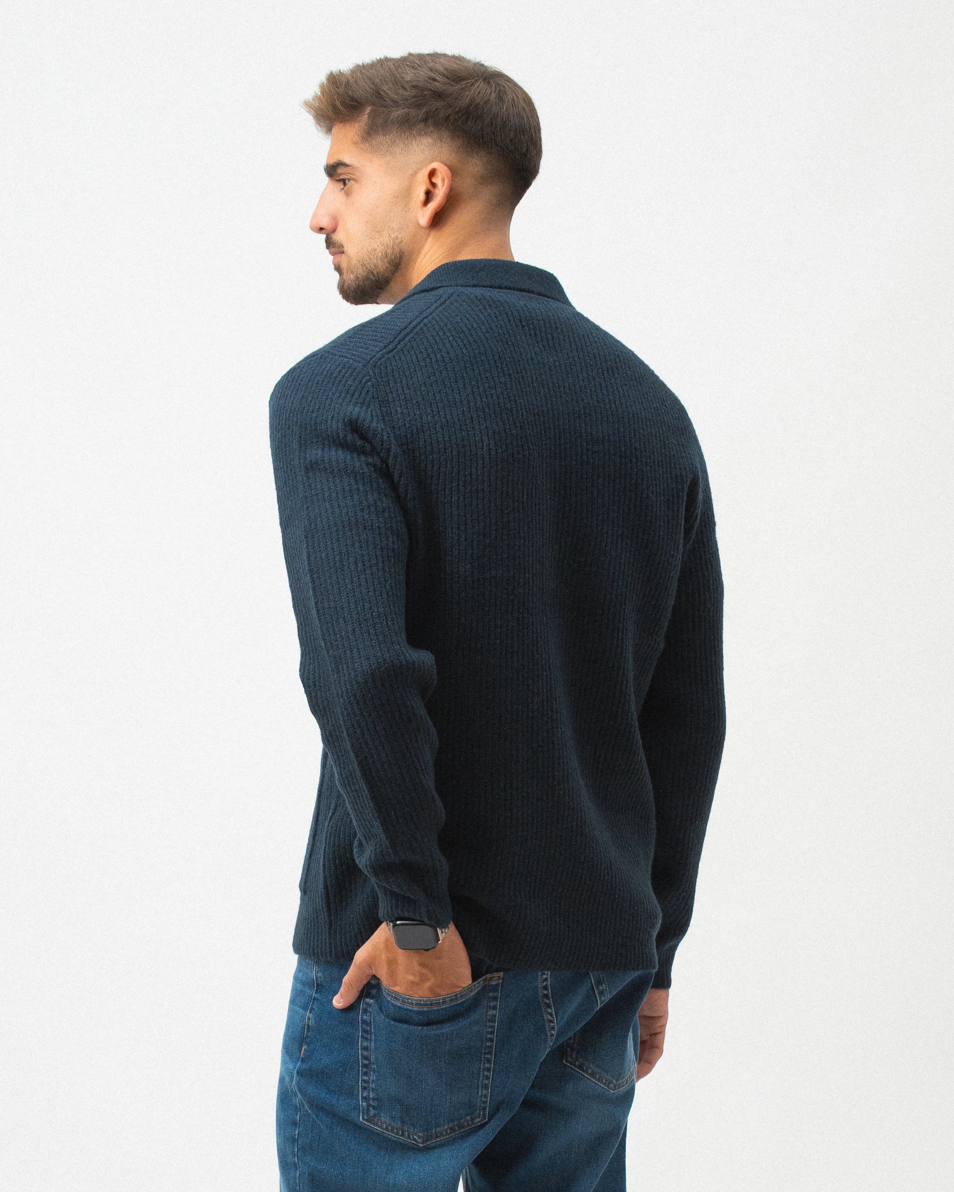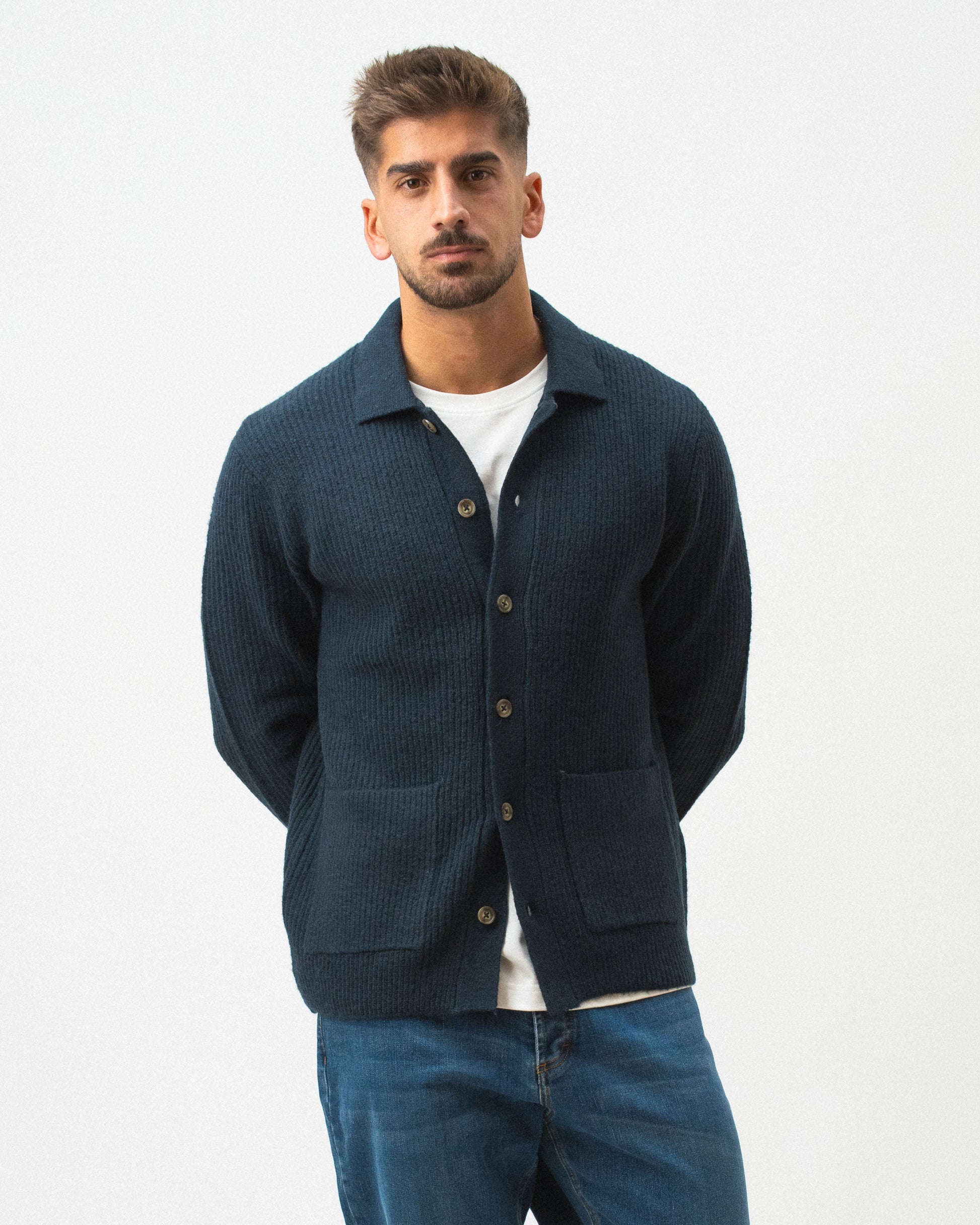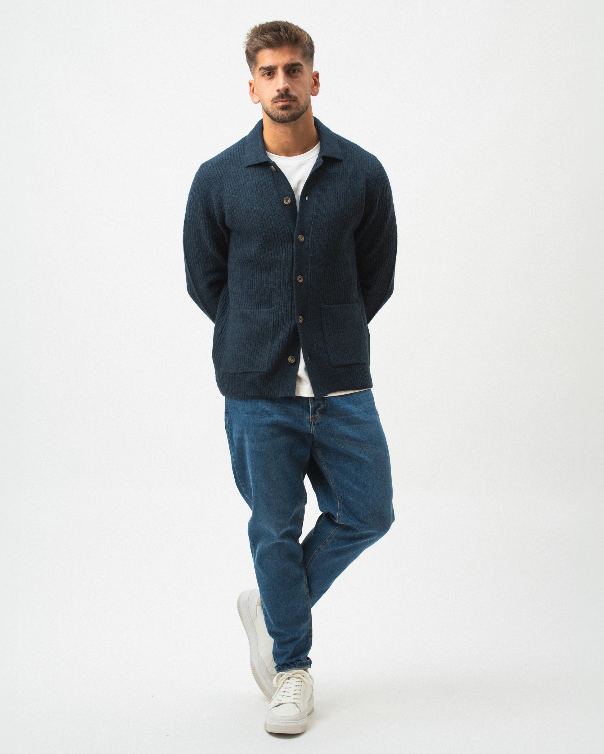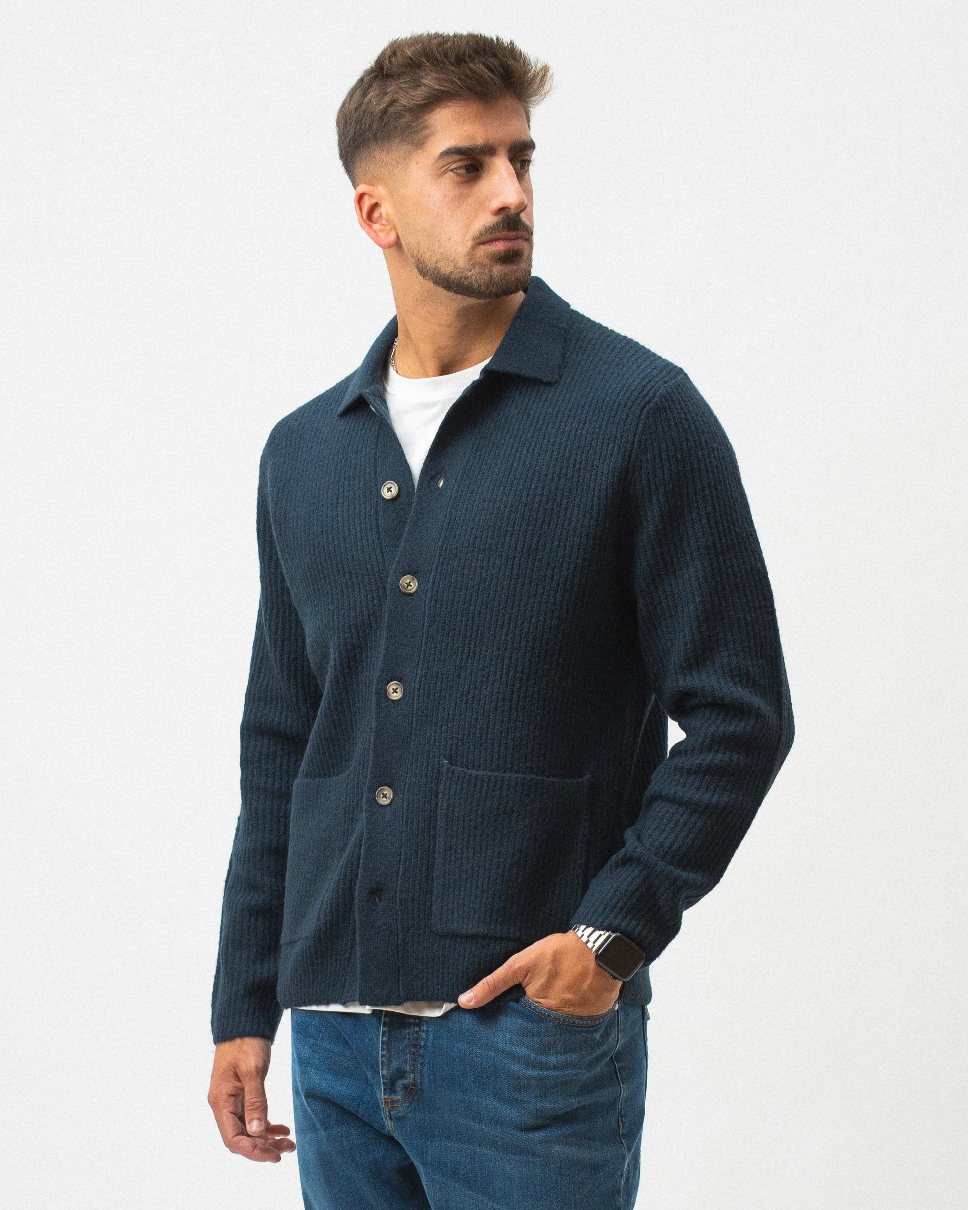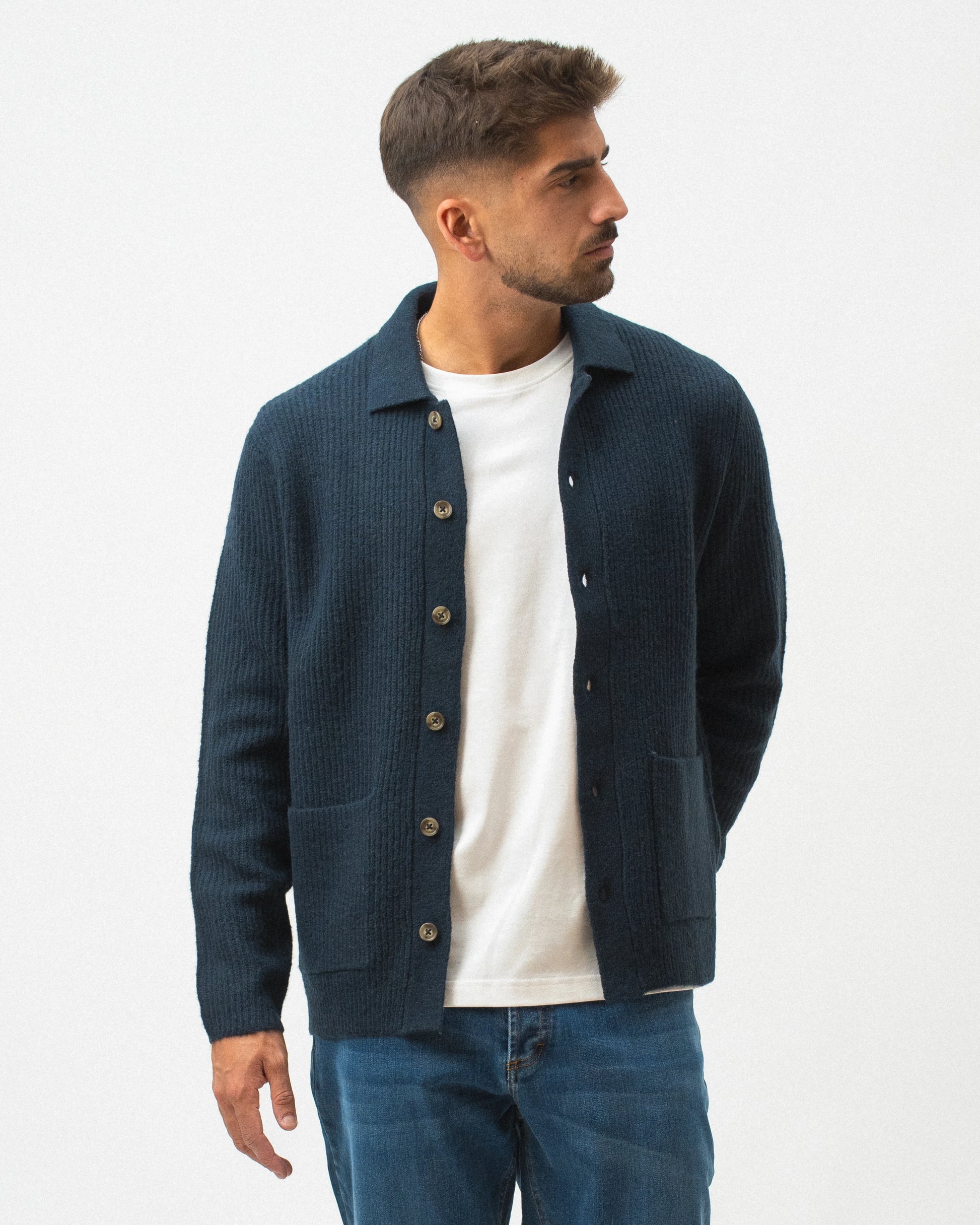 Gola de camisa. Fecho frontal com botões. Punhos e base com terminações caneladas.