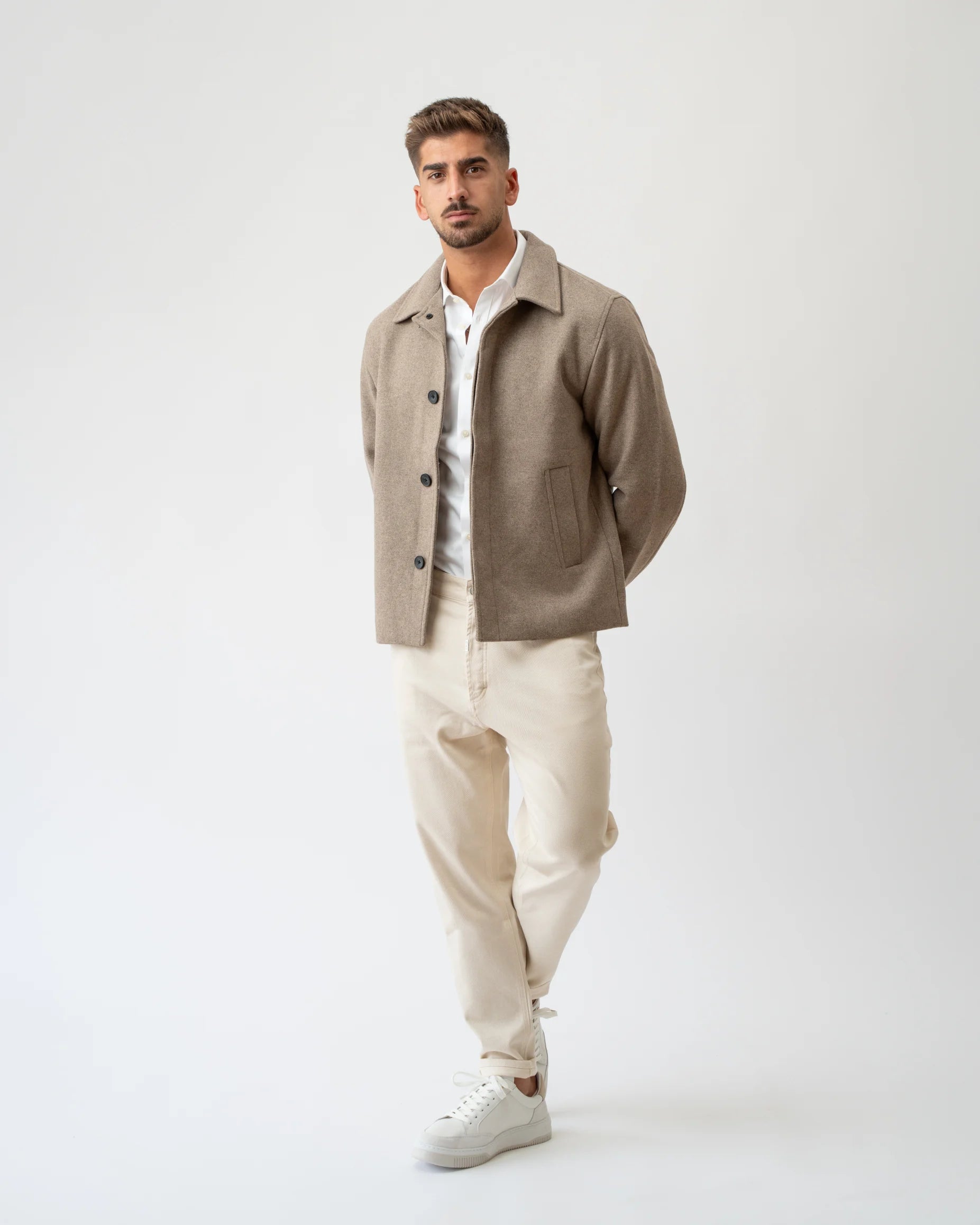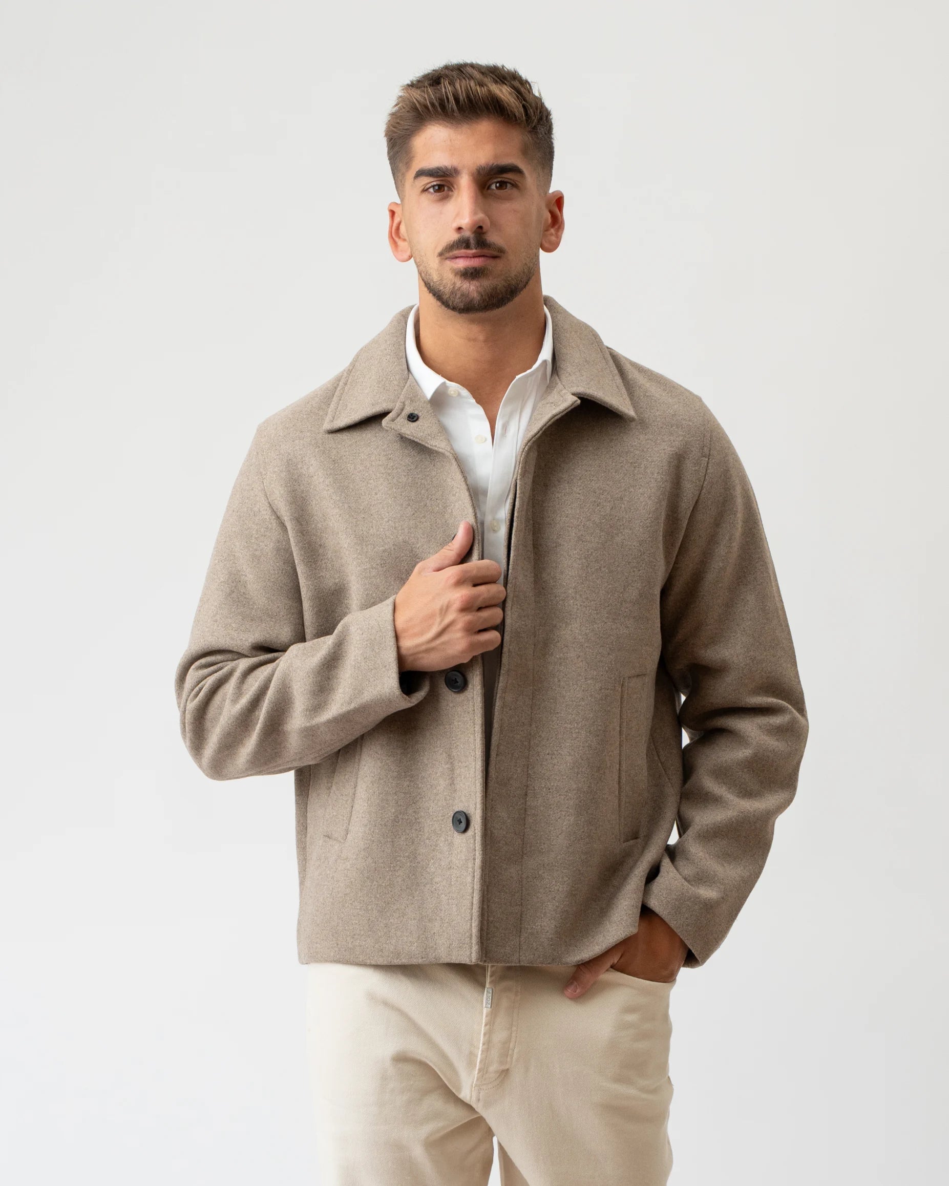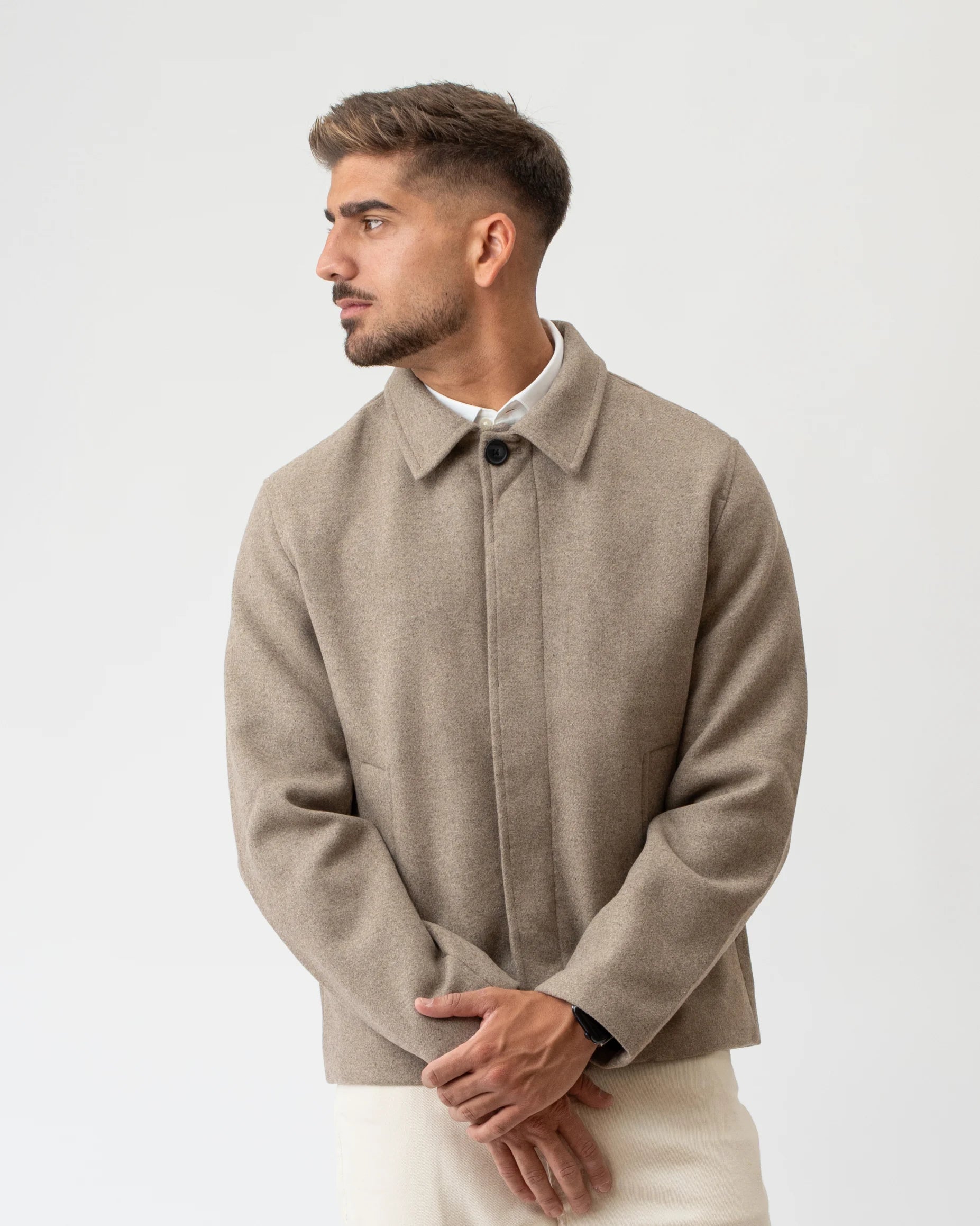 Casaco confecionado em tecido com lã. Gola de abas e manga comprida. Bolsos de chapa na anca. Fecho frontal com botão. Casaco mais curto e fit mais relaxado.