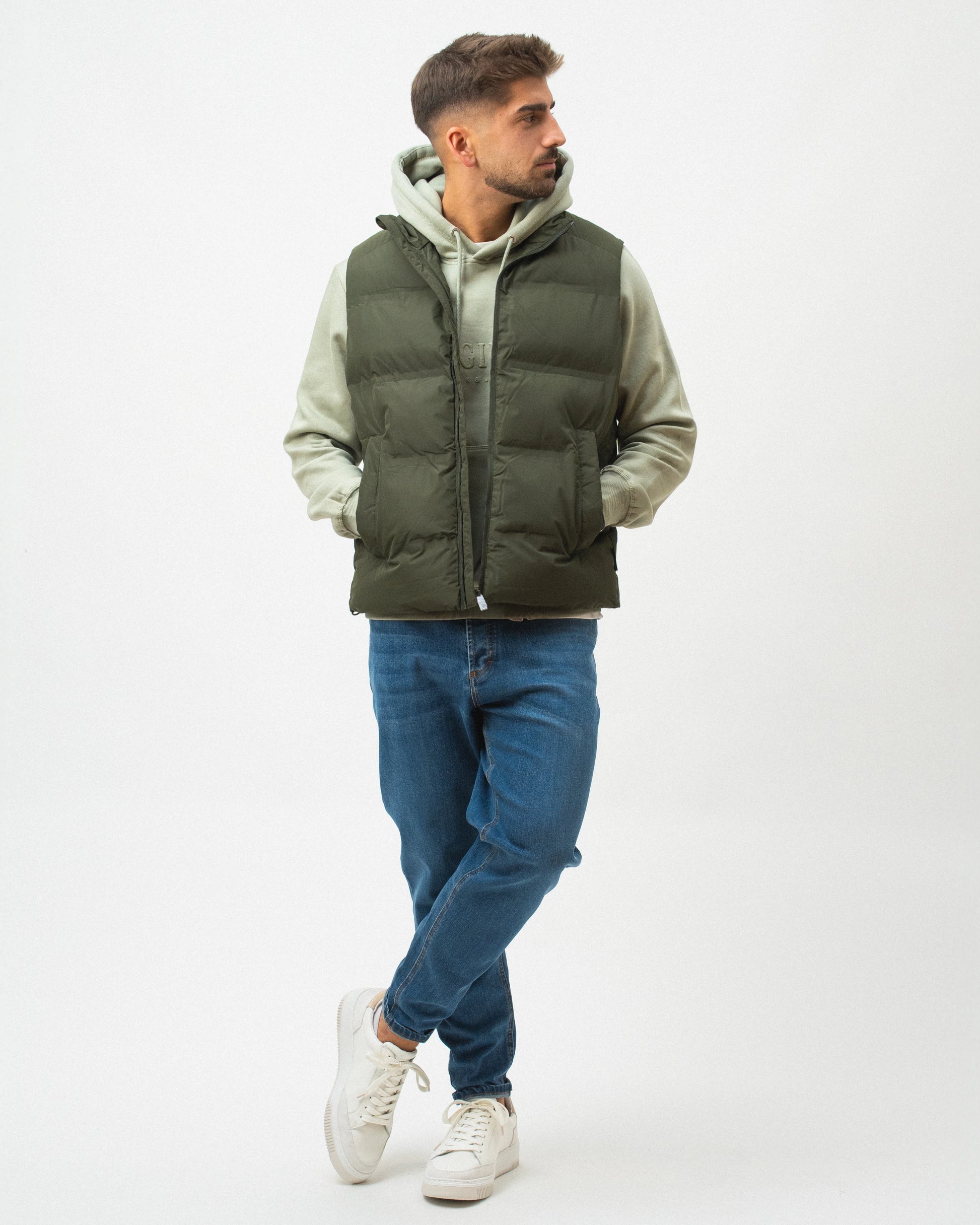 Colete regular fit. Gola subida e sem mangas. Bolsos debruados na anca. Detalhe de bolso interior. Fecho frontal com fecho de correr.