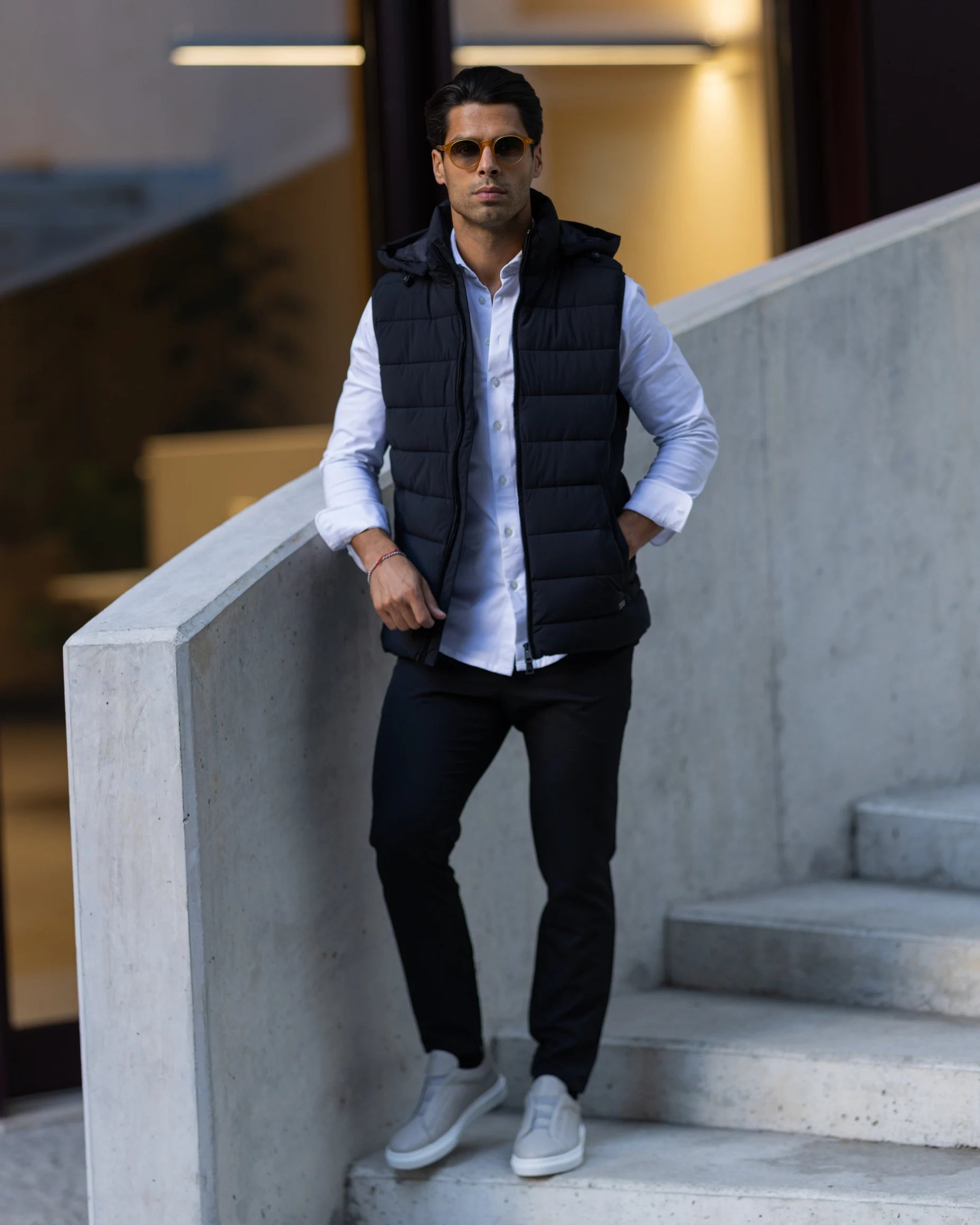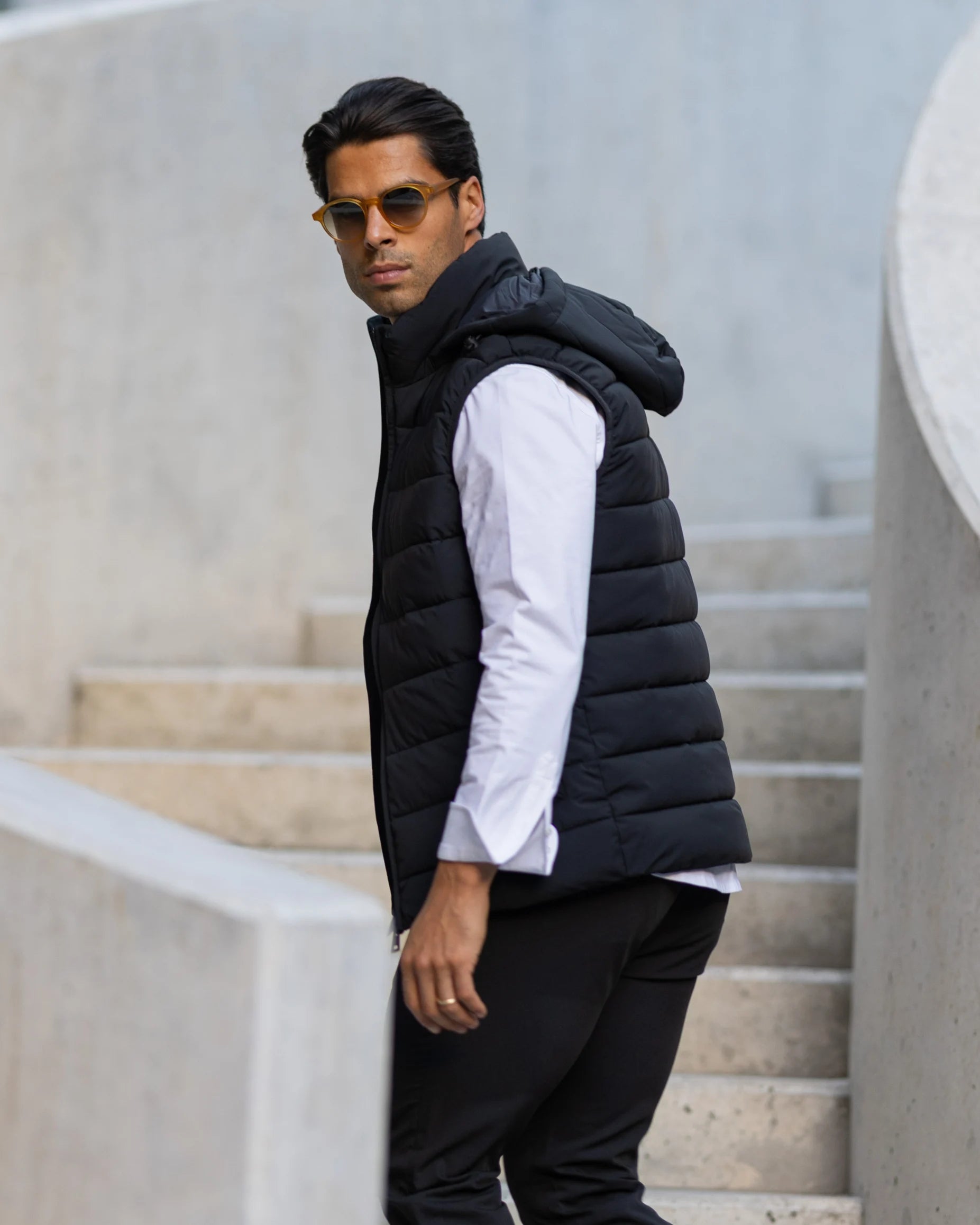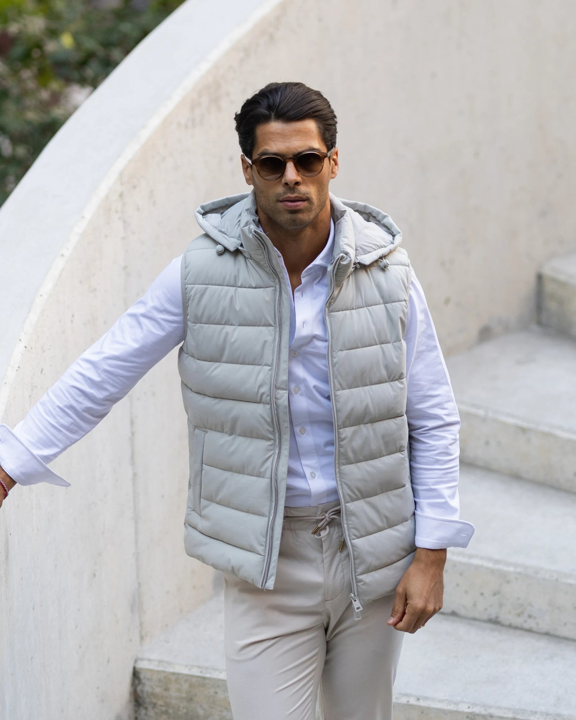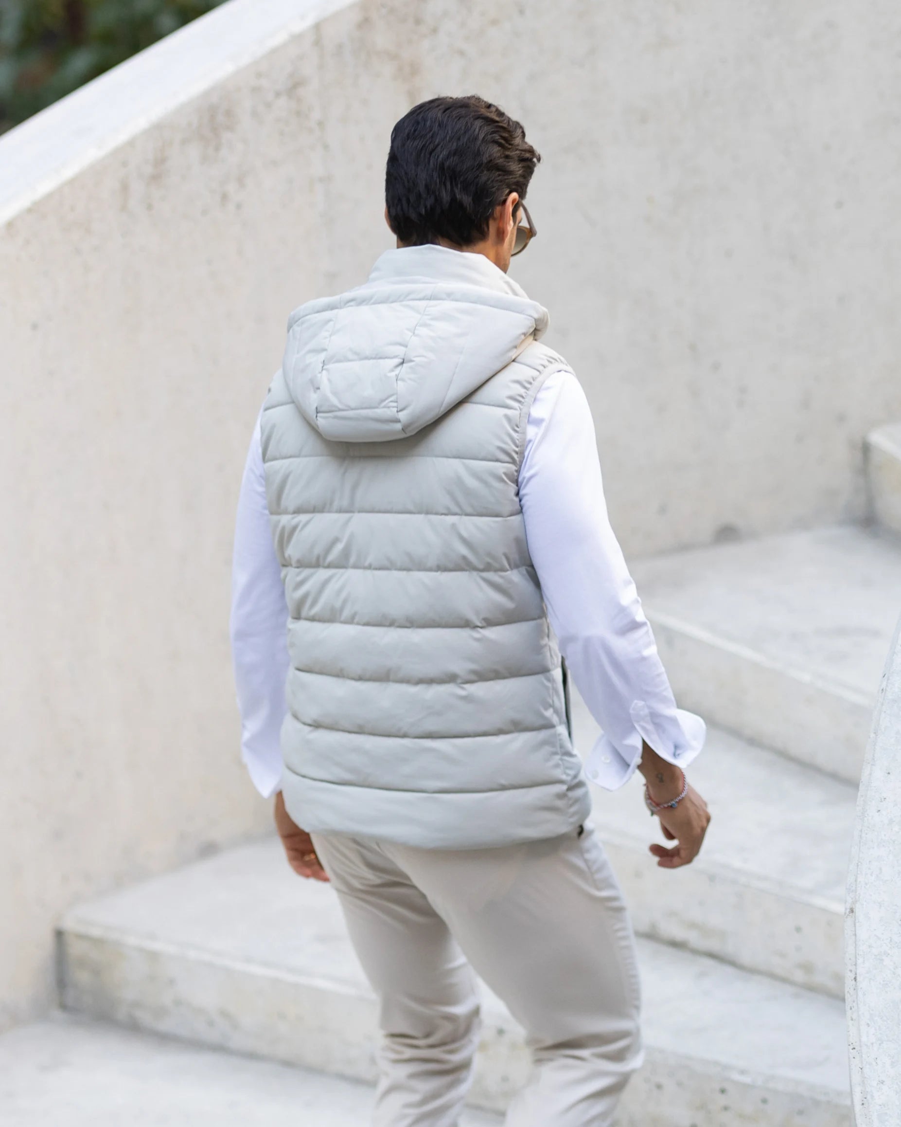 Colete impermeável com fecho frontal duplo, dois bolsos laterais e capuz removível. Feito em tecido repelente à água, oferece versatilidade e funcionalidade para diversas ocasiões.