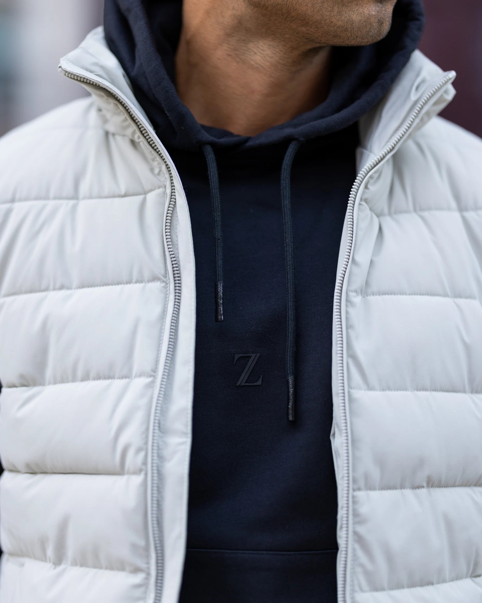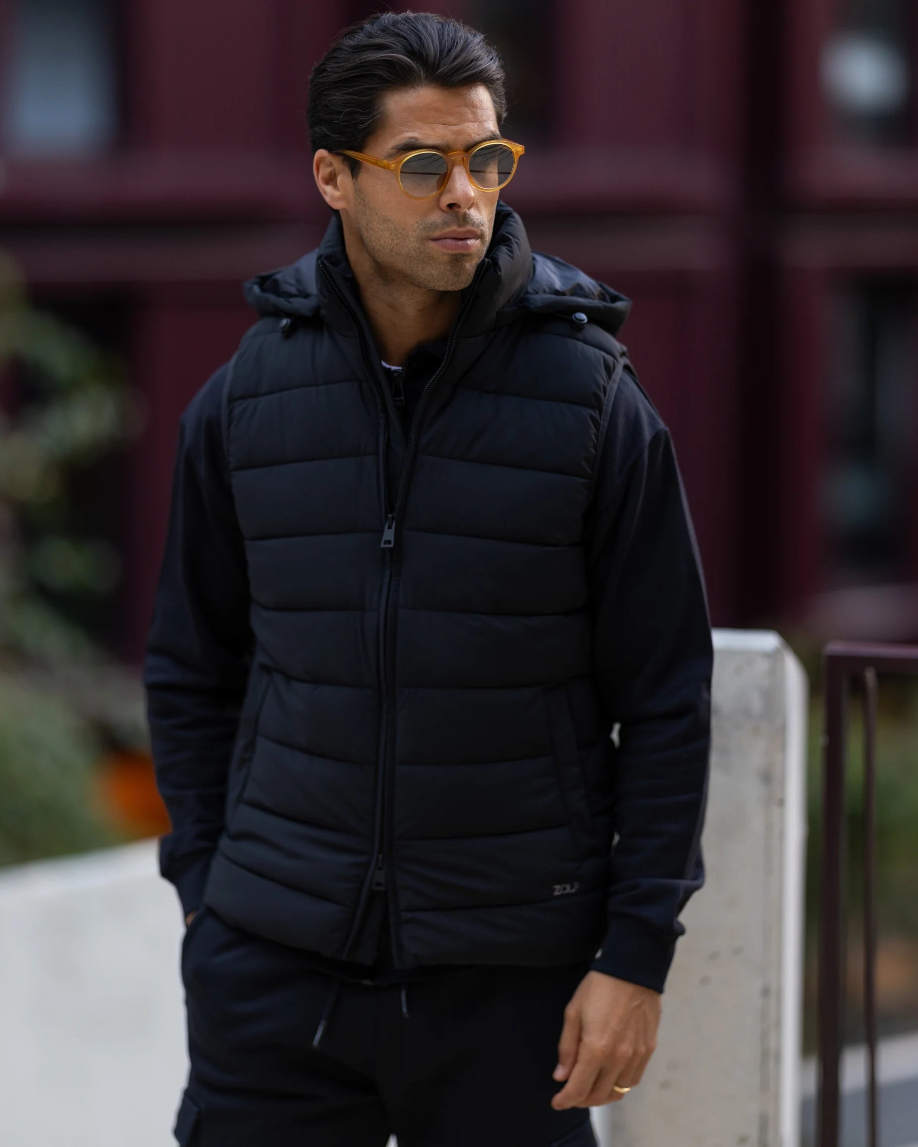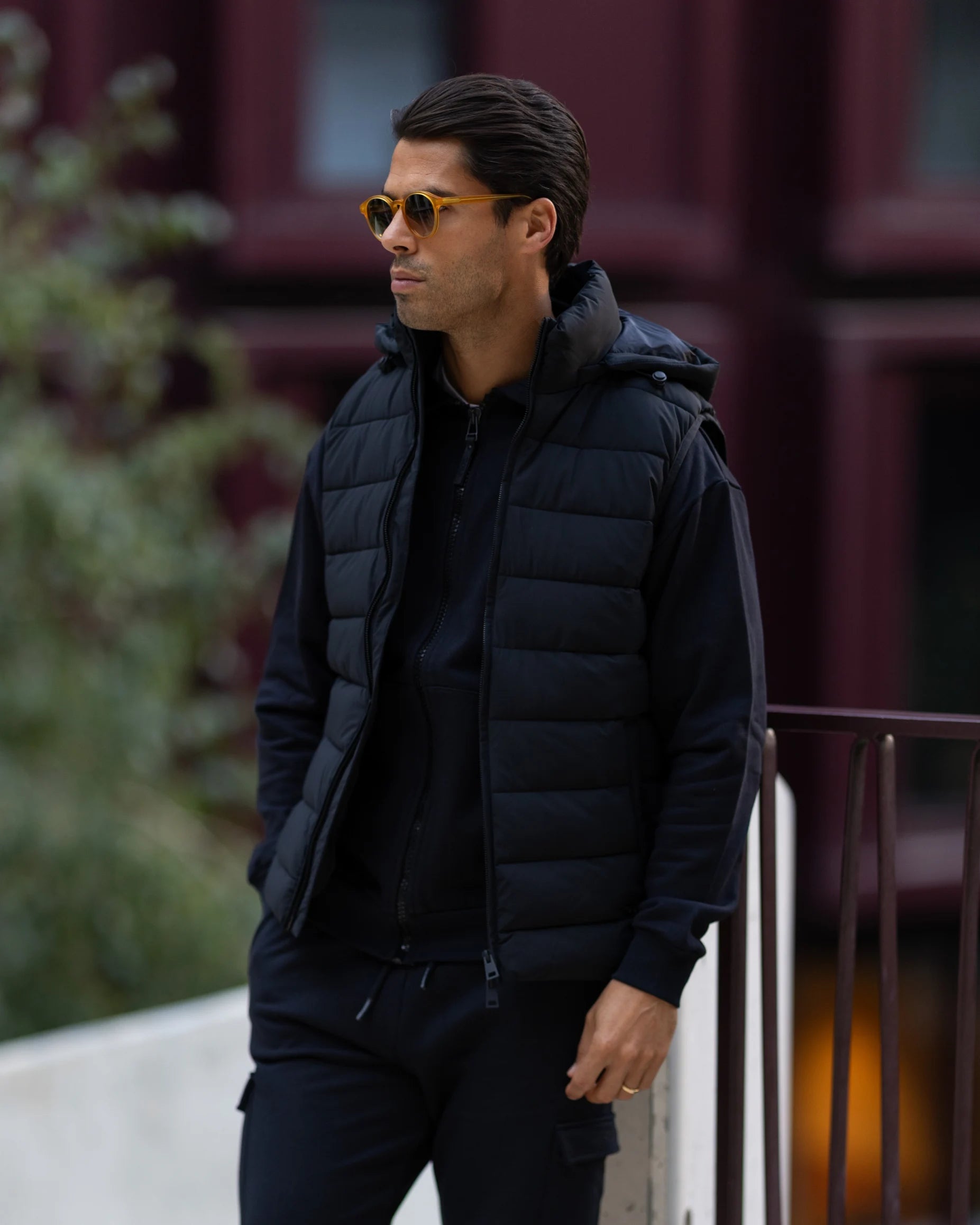 Colete impermeável com fecho frontal duplo, dois bolsos laterais e capuz removível. Feito em tecido repelente à água, oferece versatilidade e funcionalidade para diversas ocasiões.