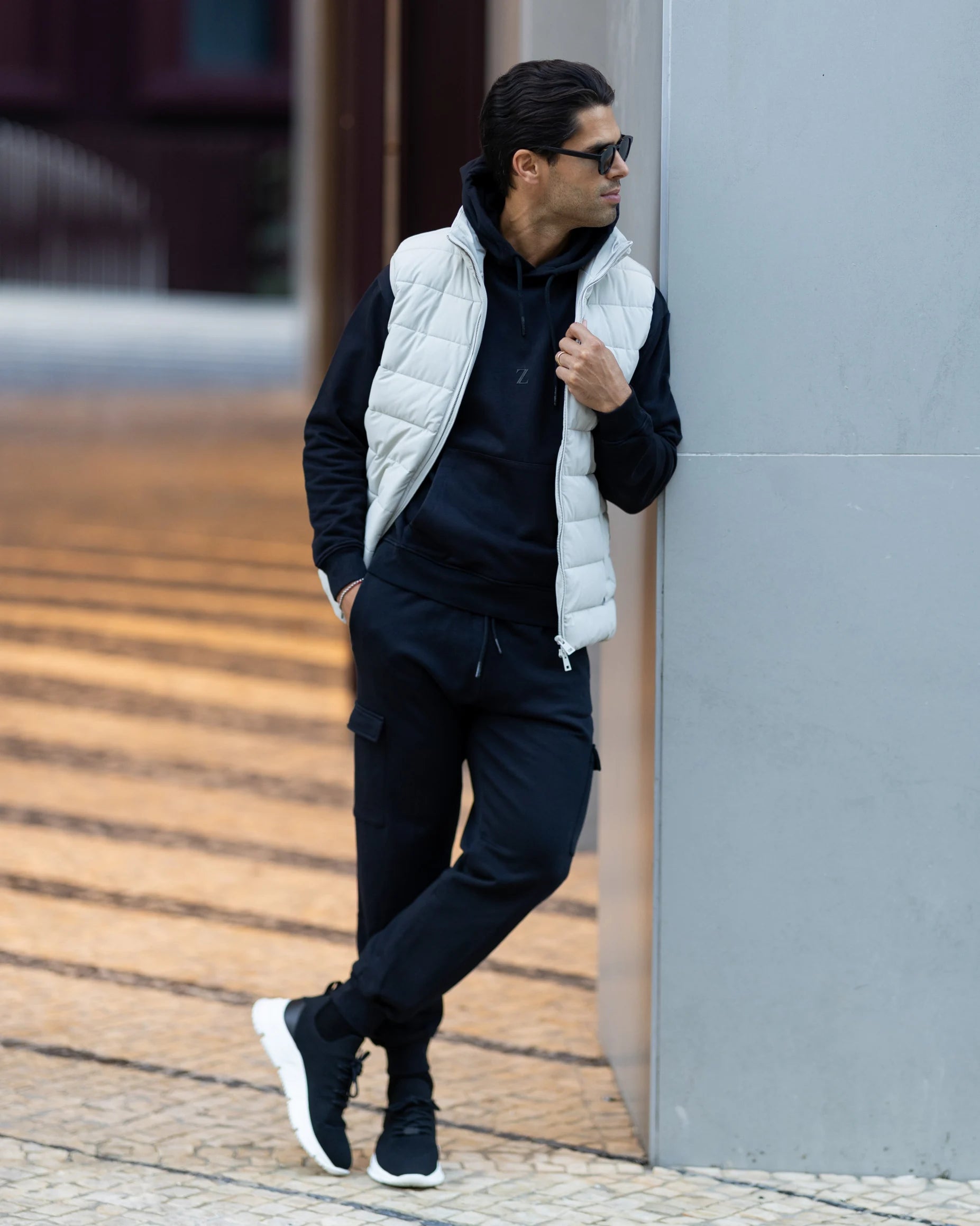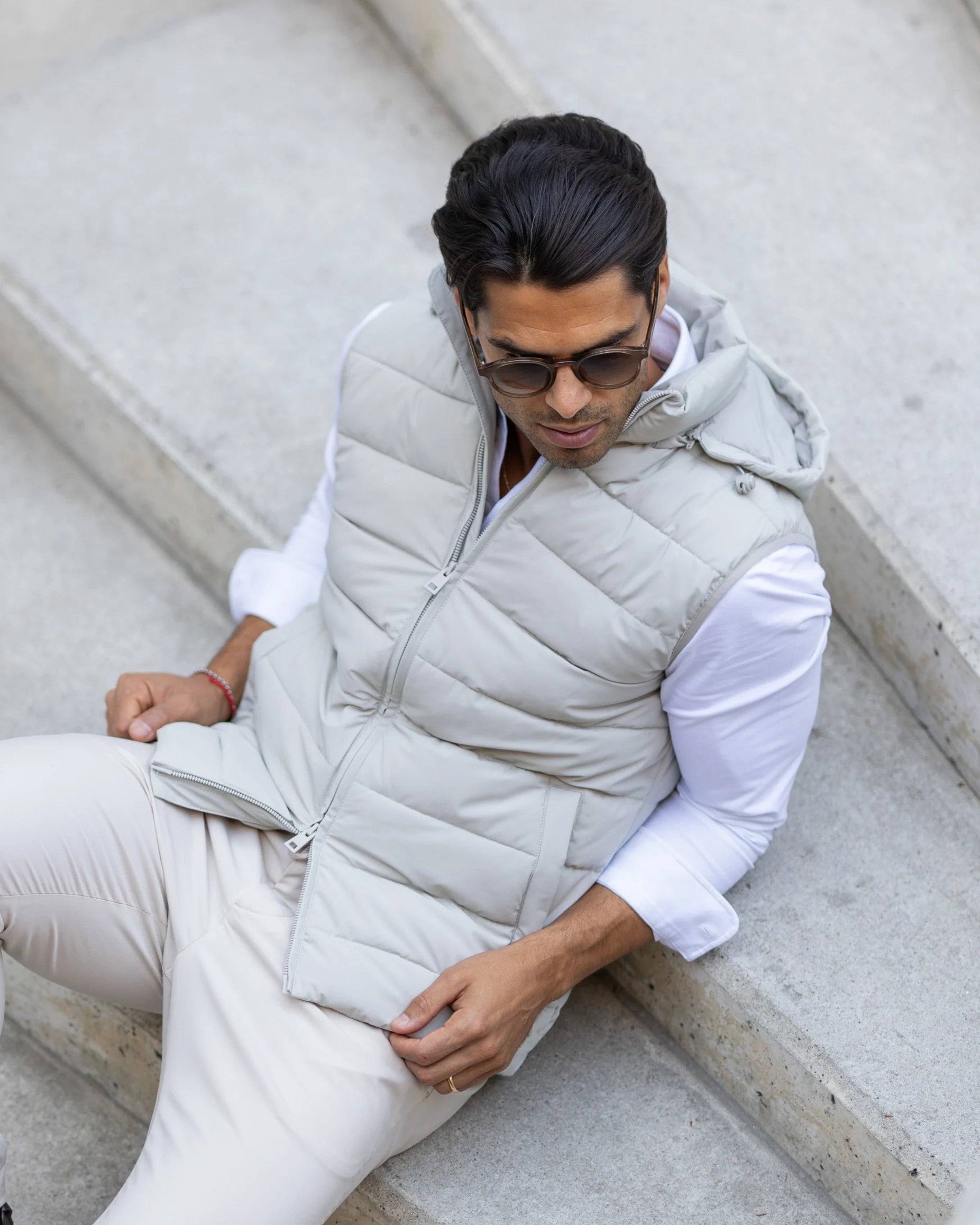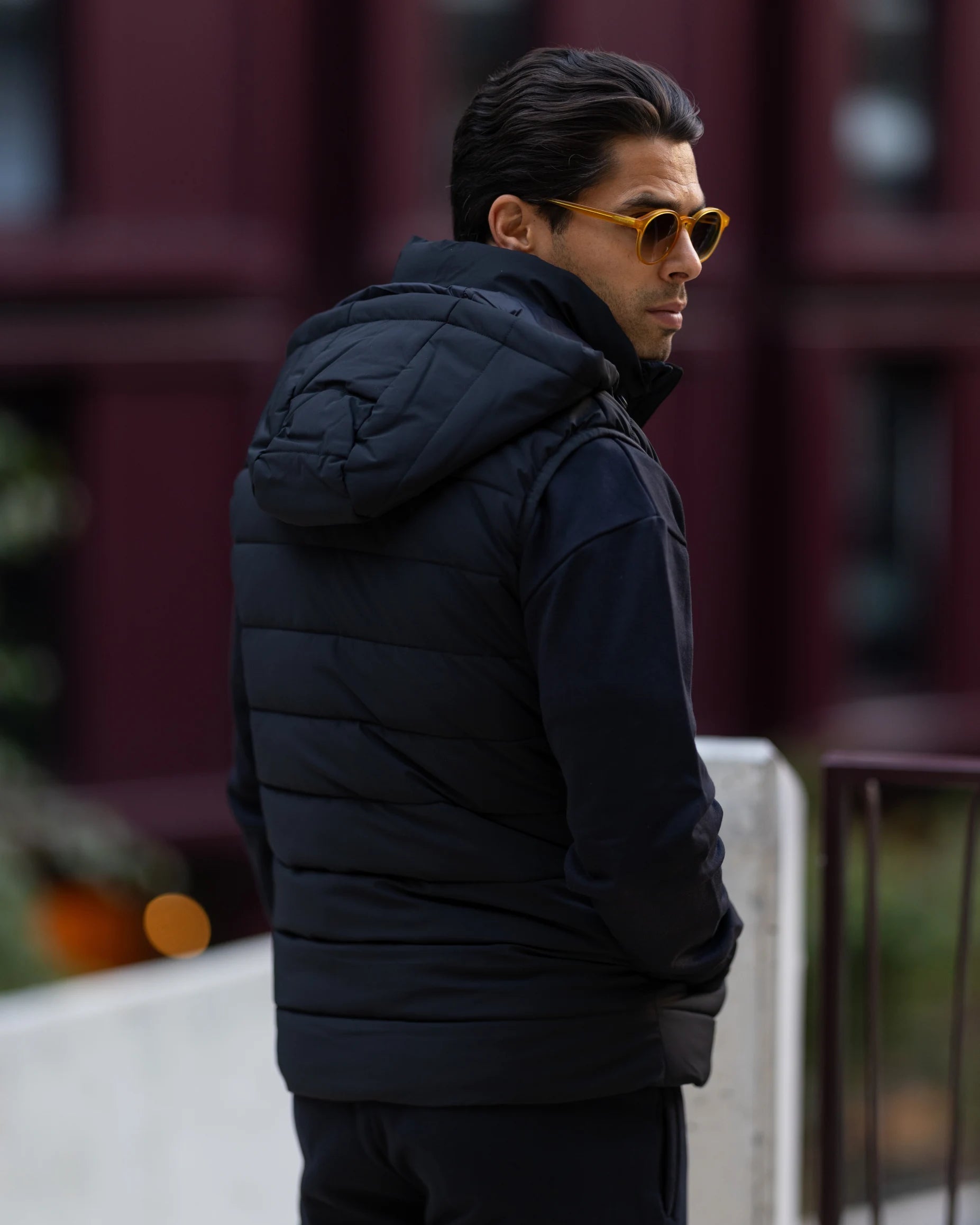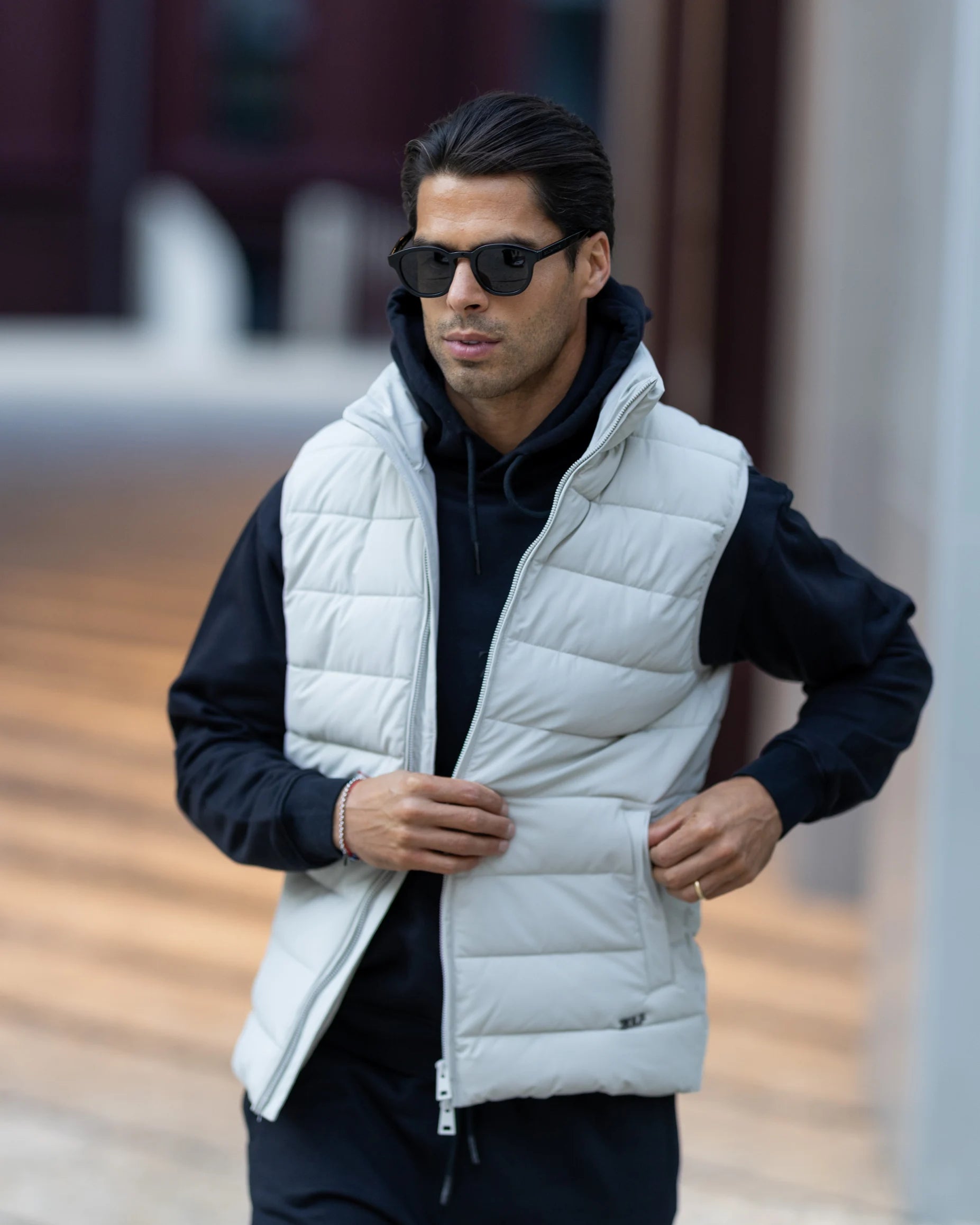 Colete impermeável com fecho frontal duplo, dois bolsos laterais e capuz removível. Feito em tecido repelente à água, oferece versatilidade e funcionalidade para diversas ocasiões.