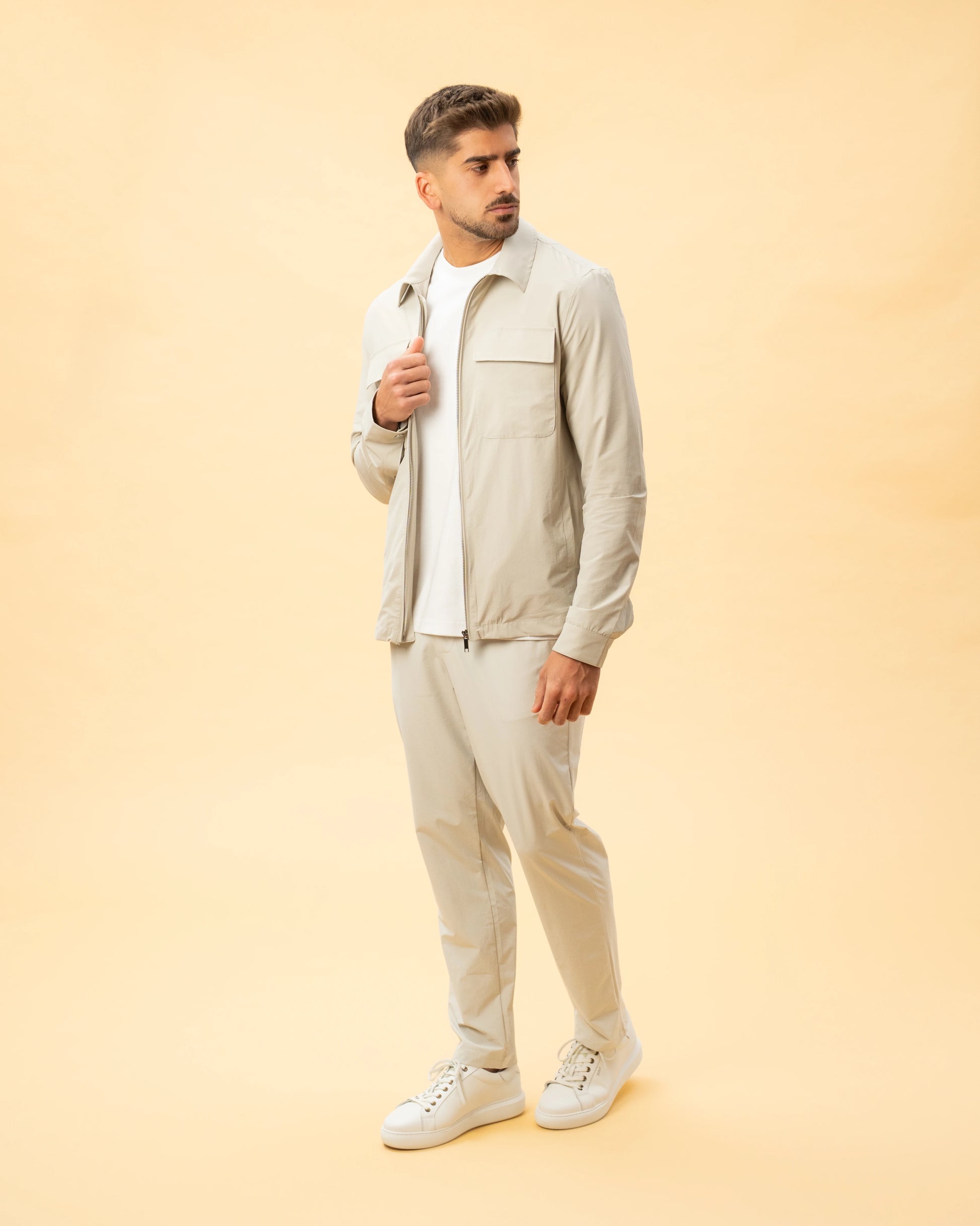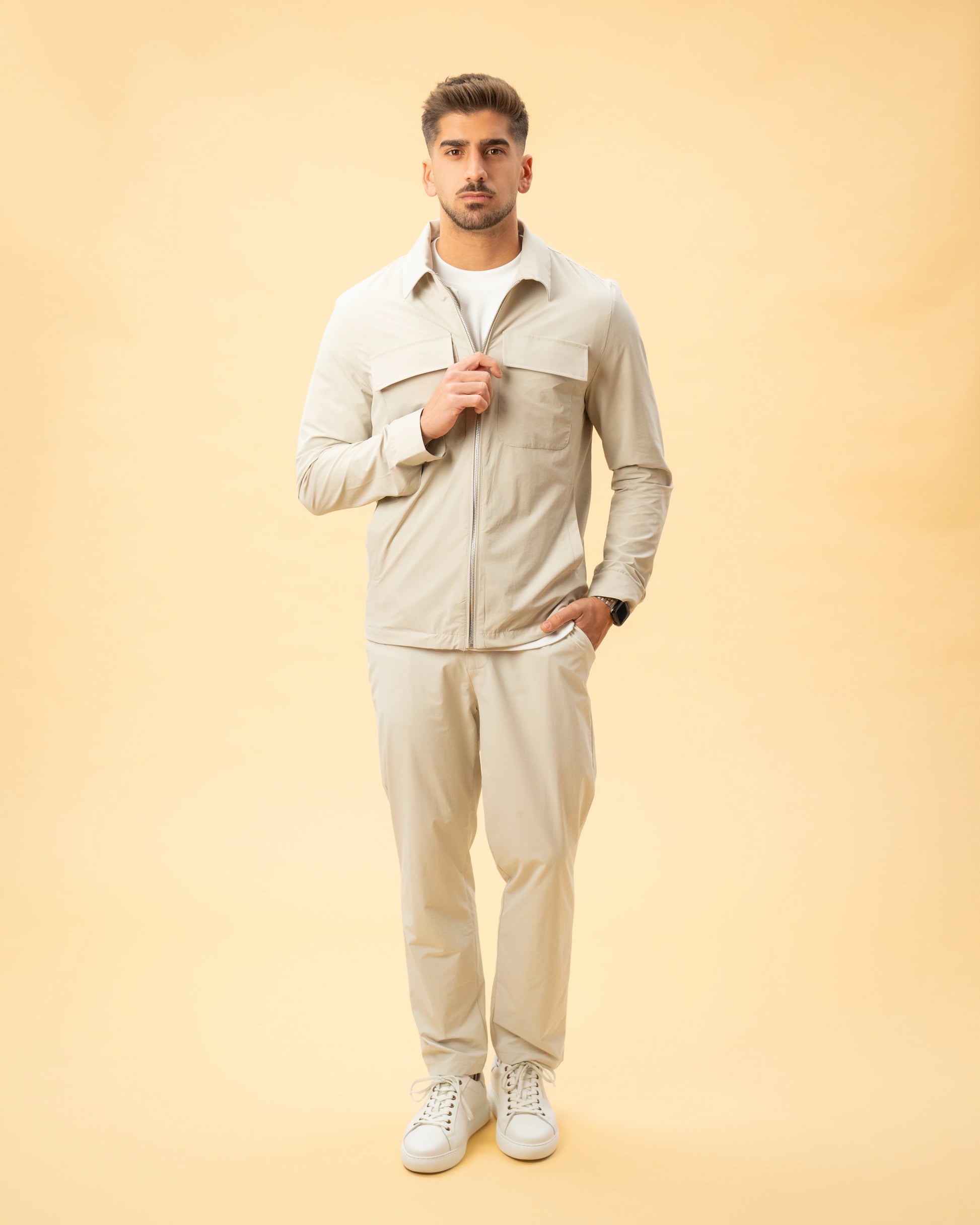 Composto por casaco leve com fecho frontal e bolsos utilitários e calças de corte regular com cintura elástica e cordão ajustável, este conjunto oferece um equilíbrio perfeito entre sofisticação e funcionalidade. O tecido leve e confortável garante liberdade de movimentos e um toque suave, ideal para o dia a dia ou ocasiões mais descontraídas.