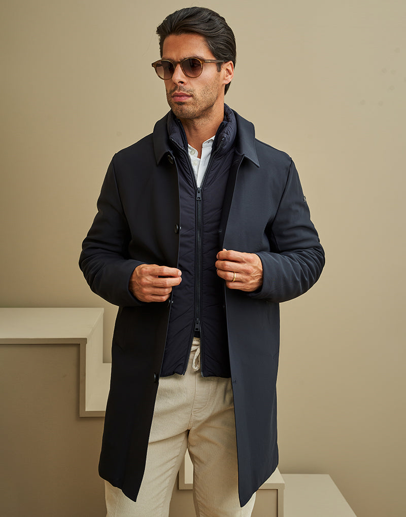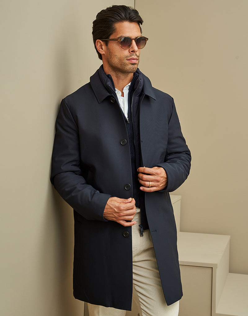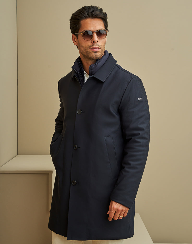Corte reto em tecido repelente à água, com colete acolchoado interior removível. Gola de camisa, fecho frontal com botões e bolsos laterais.
