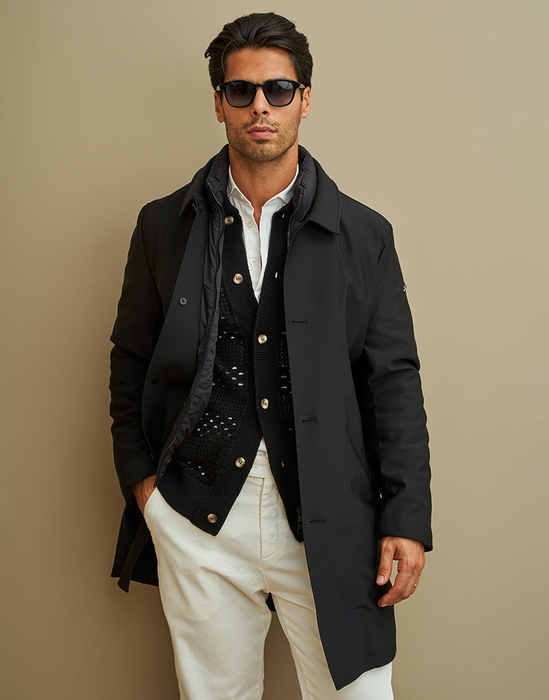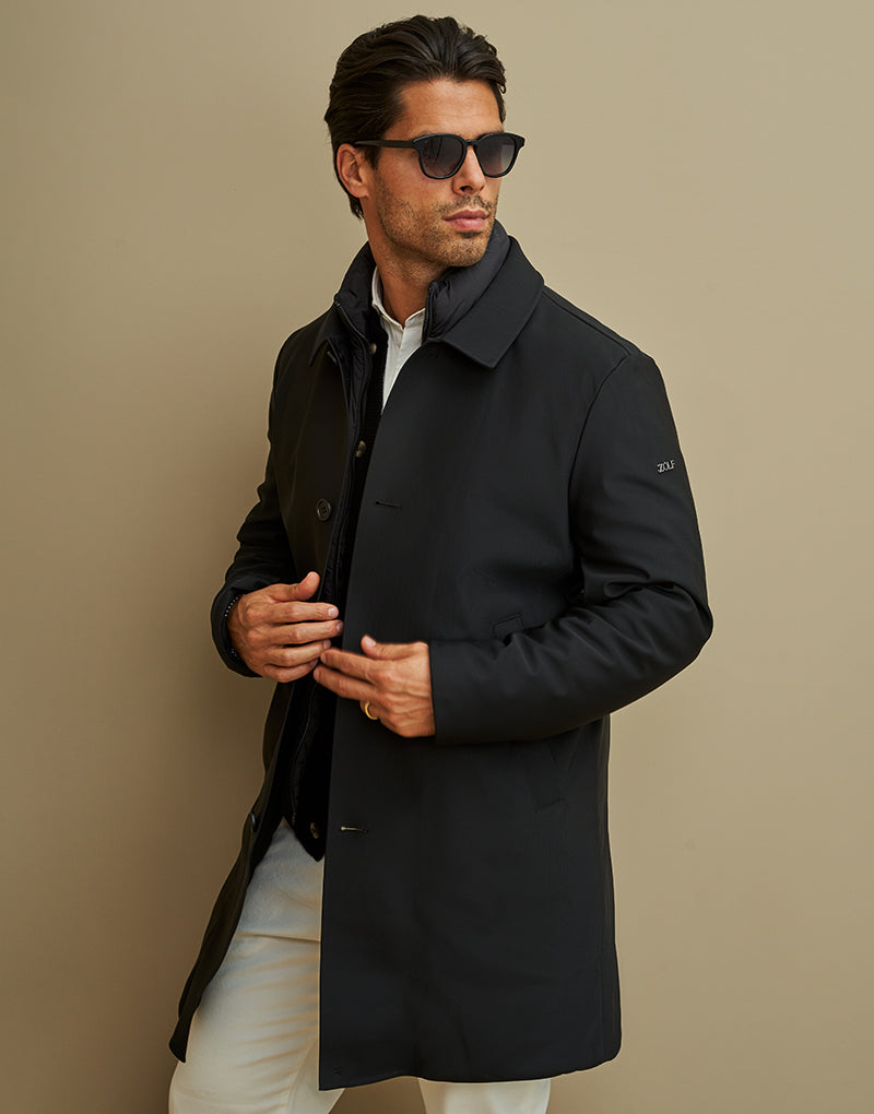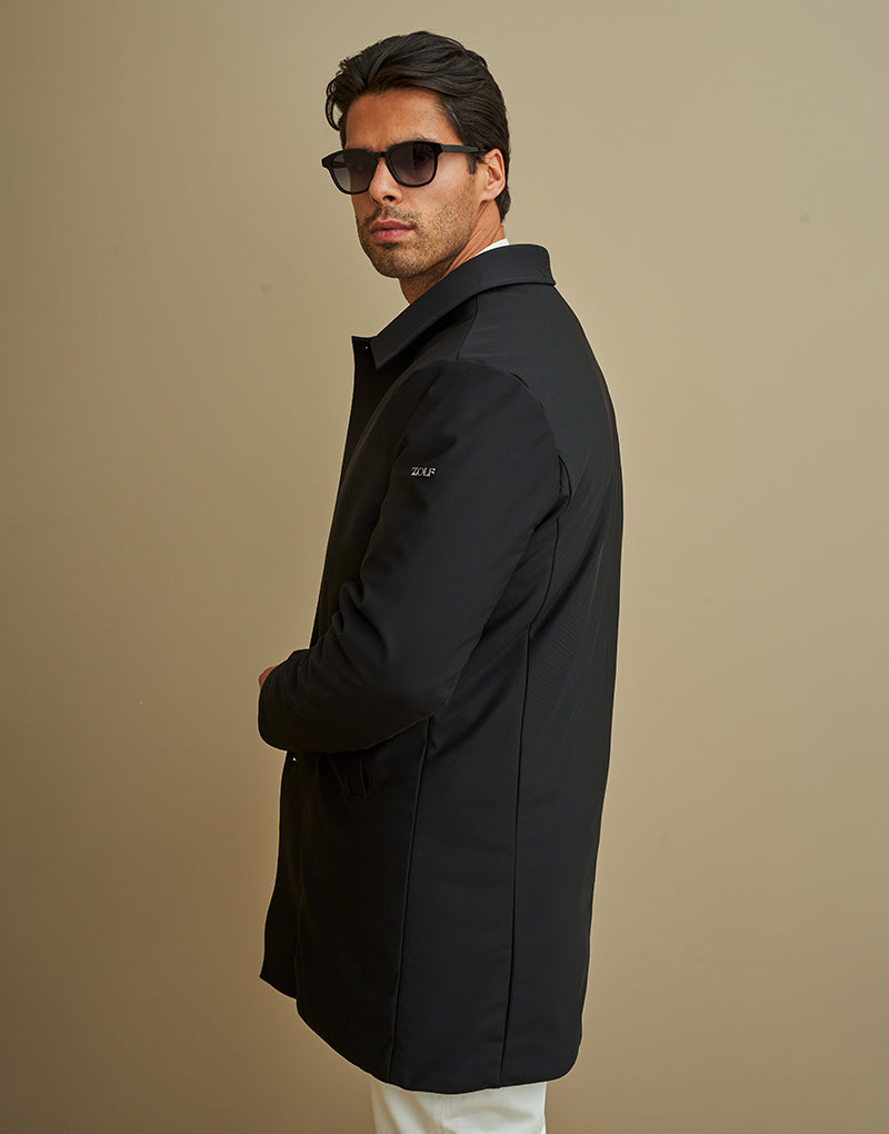 Corte reto em tecido repelente à água, com colete acolchoado interior removível. Gola de camisa, fecho frontal com botões e bolsos laterais.