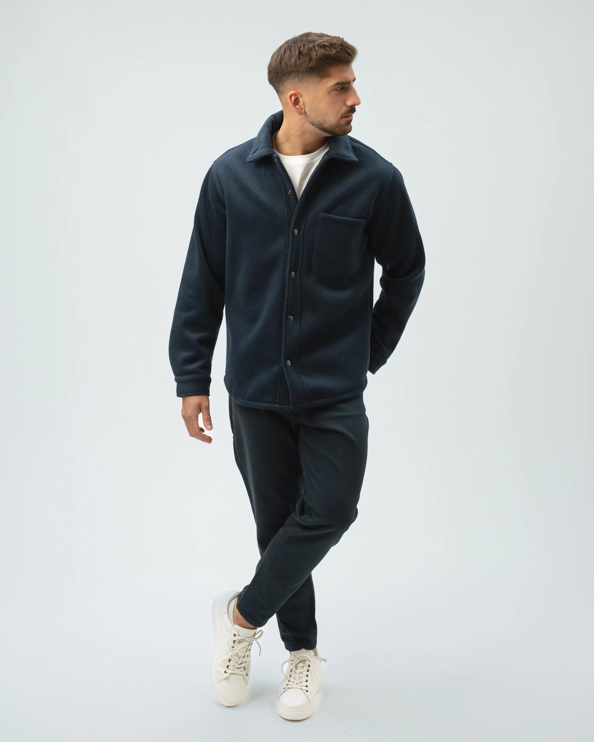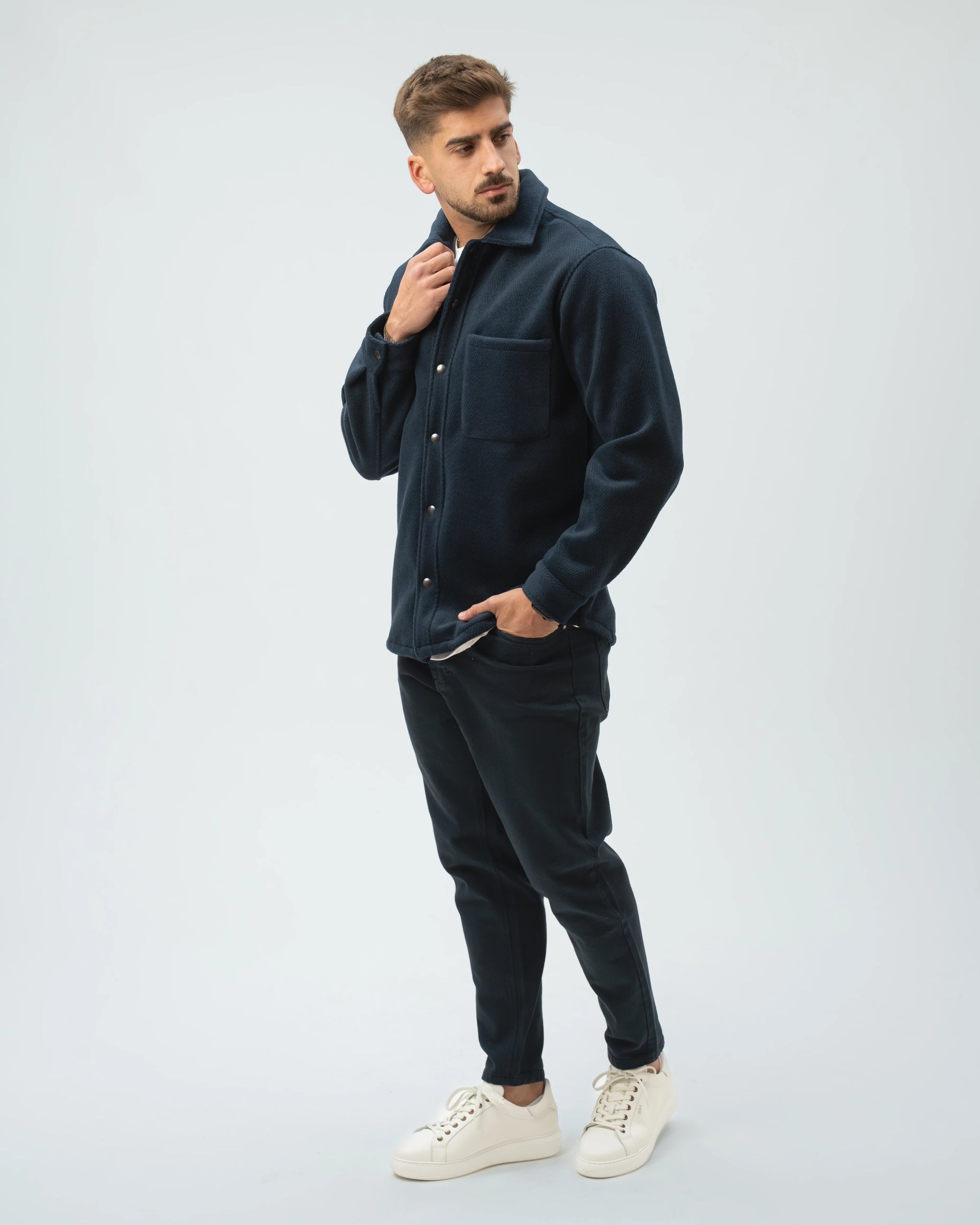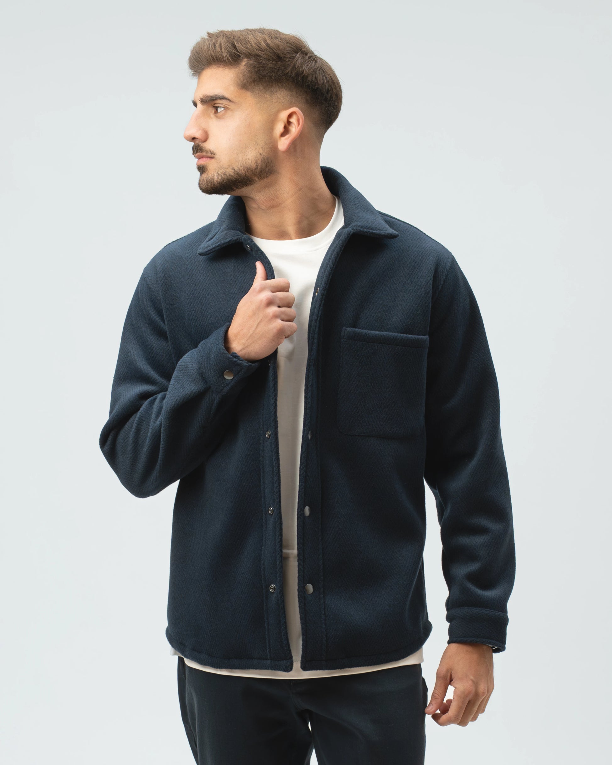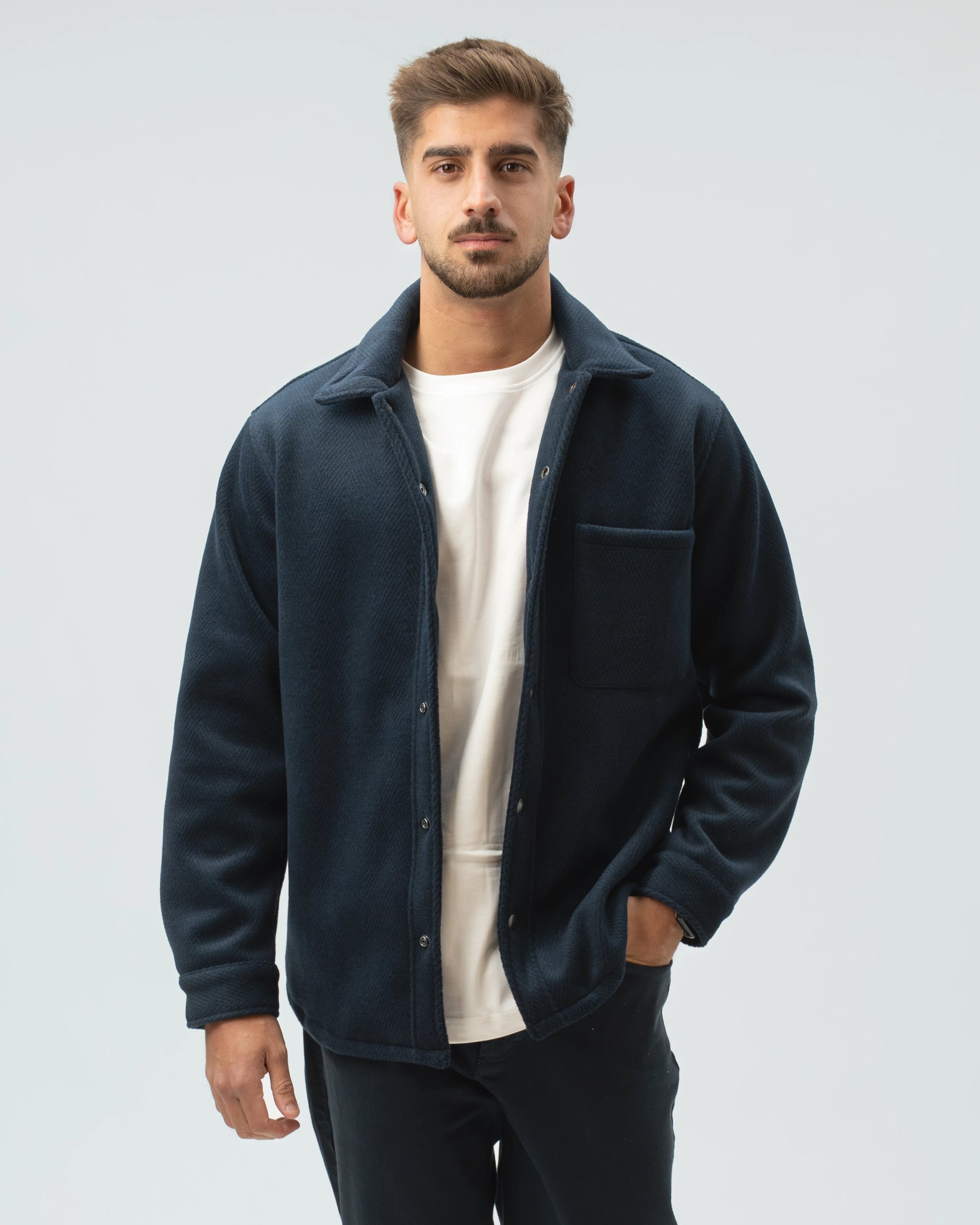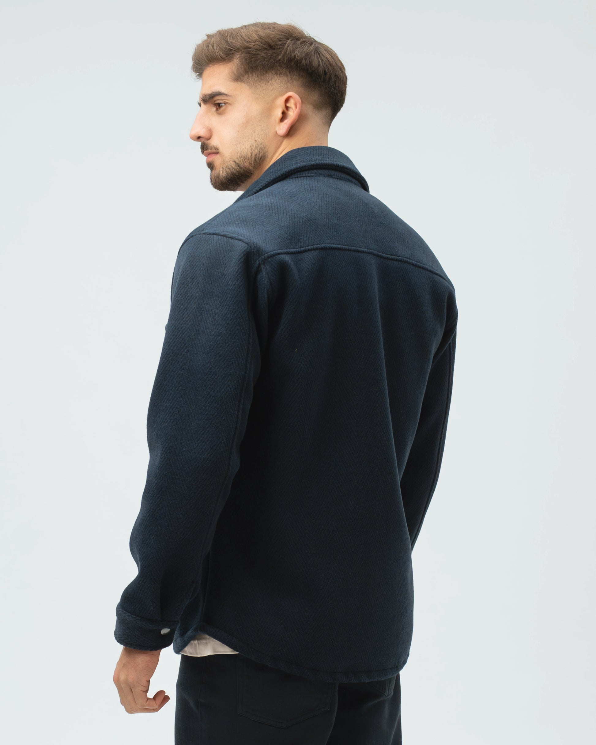 A nossa Overshirt em Lã Batida combina a estrutura de um casaco com o conforto de uma camisa pesada. Com uma textura clássica em padrão Herringbone (espinha), esta peça é o equilíbrio perfeito entre o visual utilitário e o refinamento urbano.