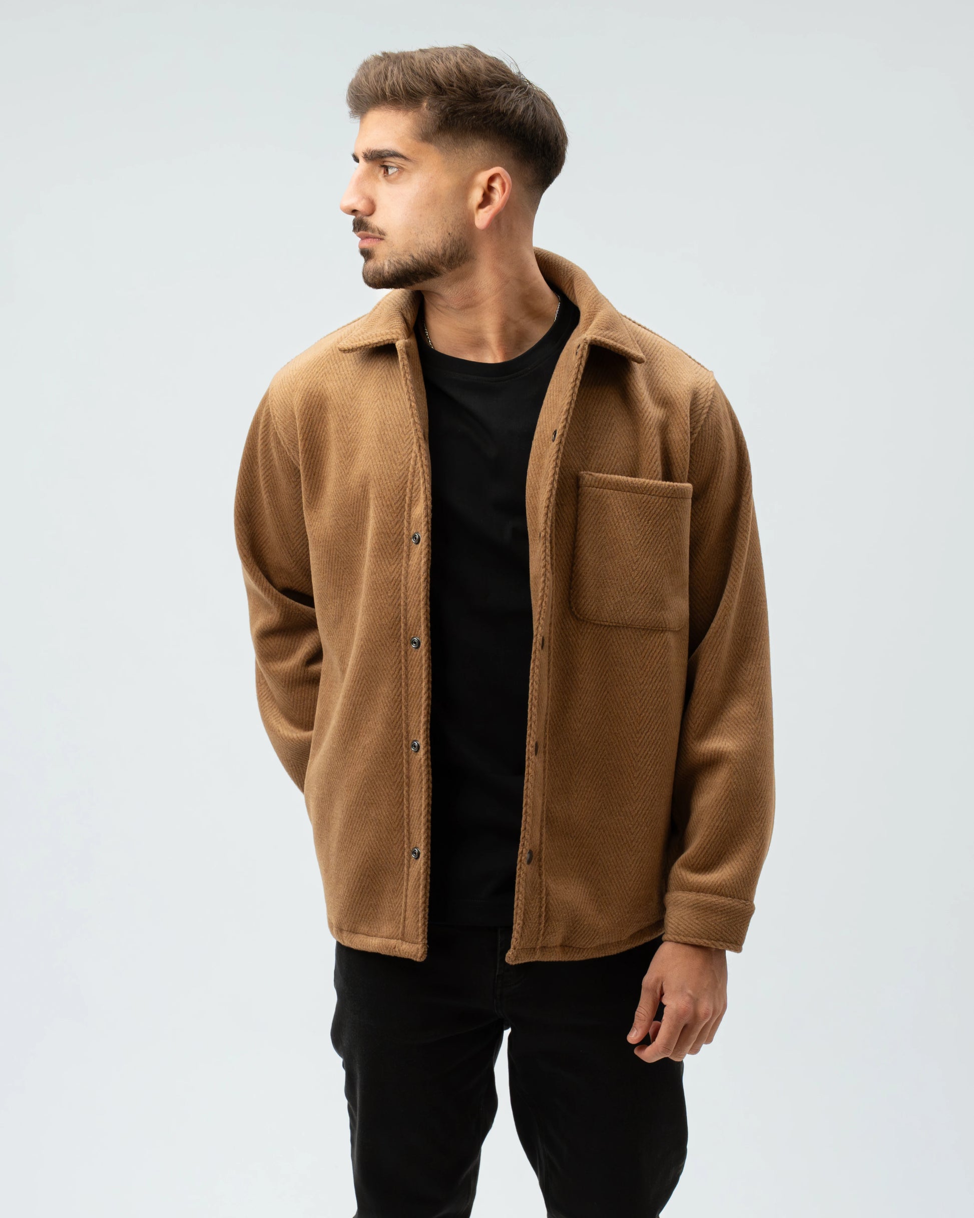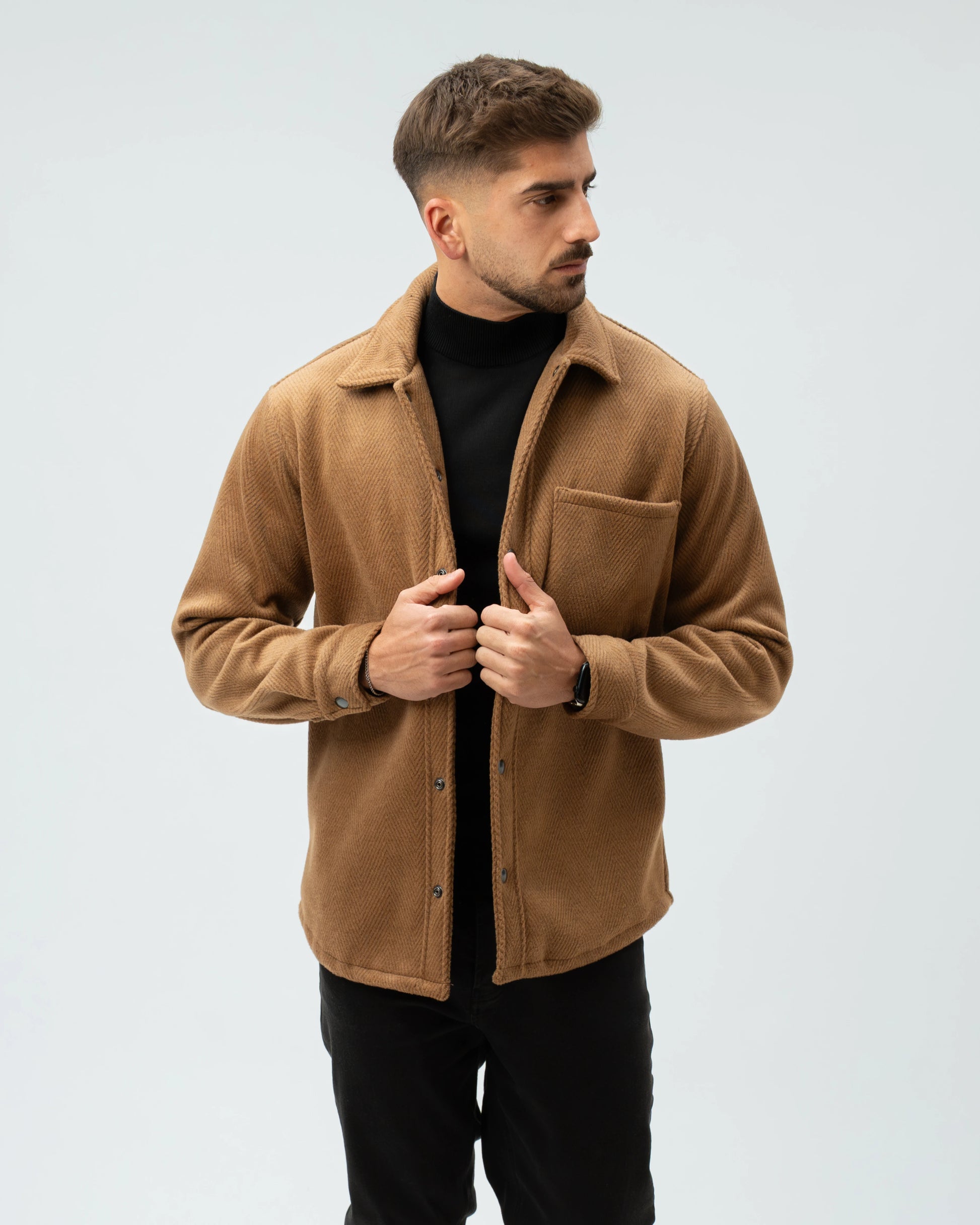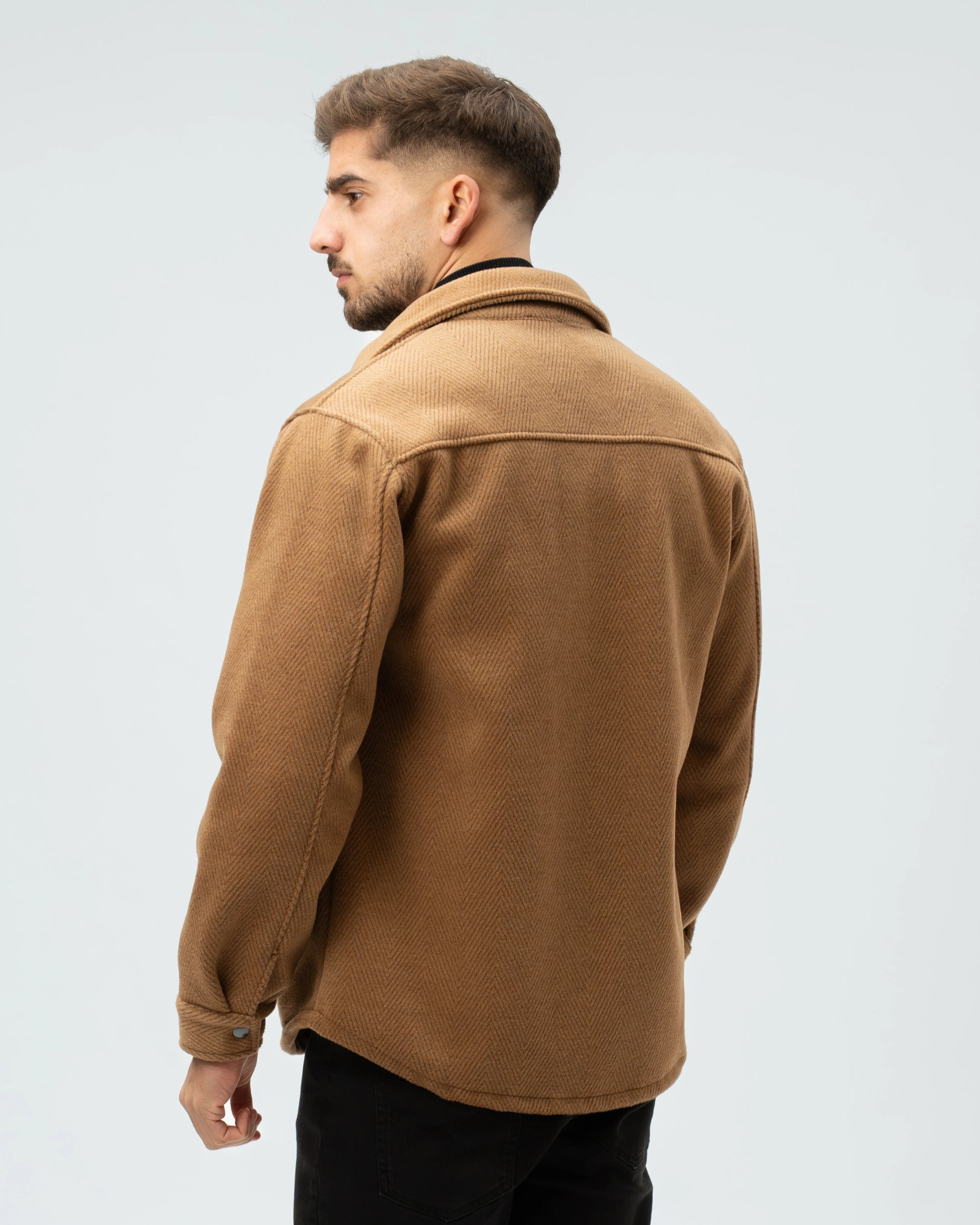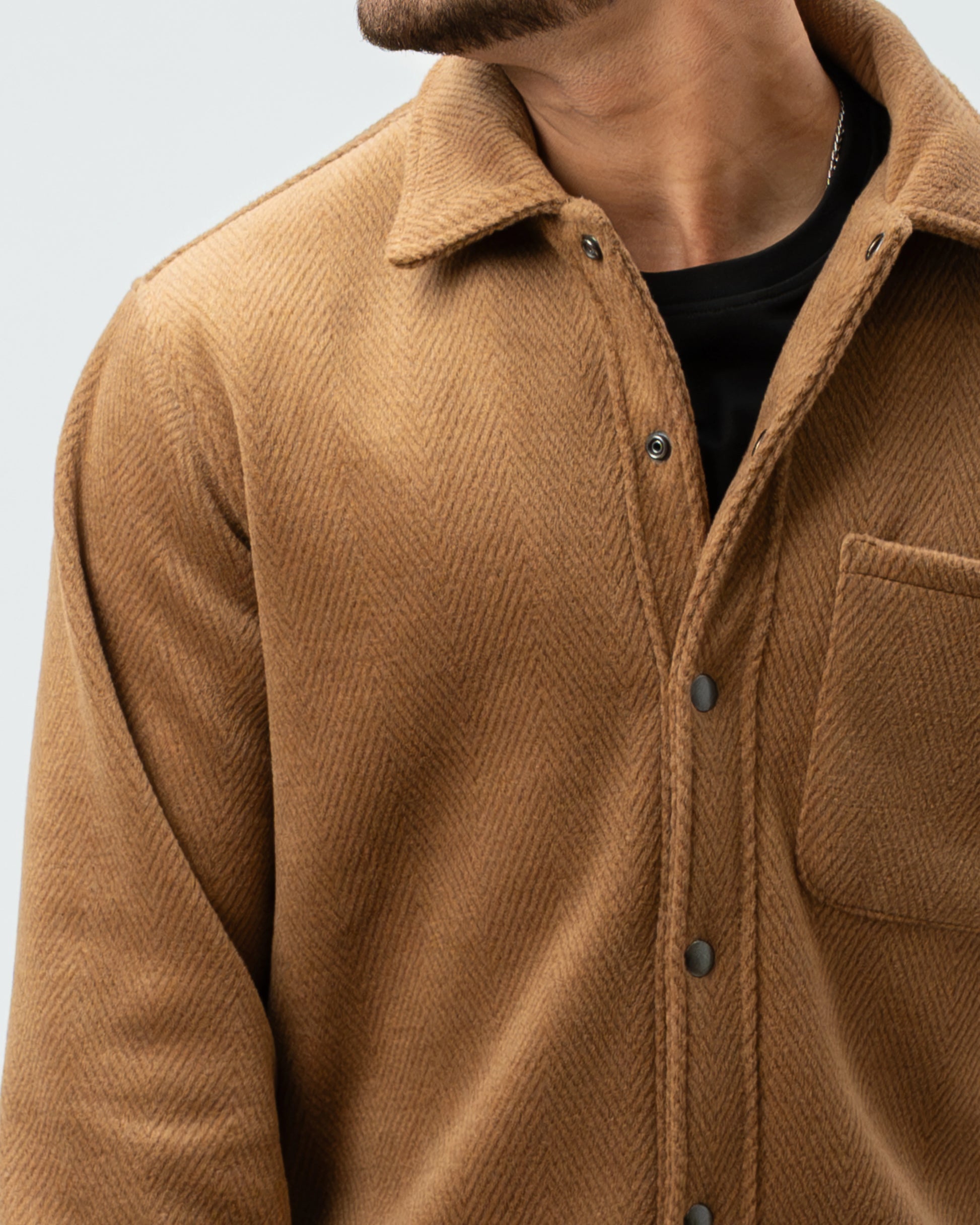 A nossa Overshirt em Lã Batida combina a estrutura de um casaco com o conforto de uma camisa pesada. Com uma textura clássica em padrão Herringbone (espinha), esta peça é o equilíbrio perfeito entre o visual utilitário e o refinamento urbano.