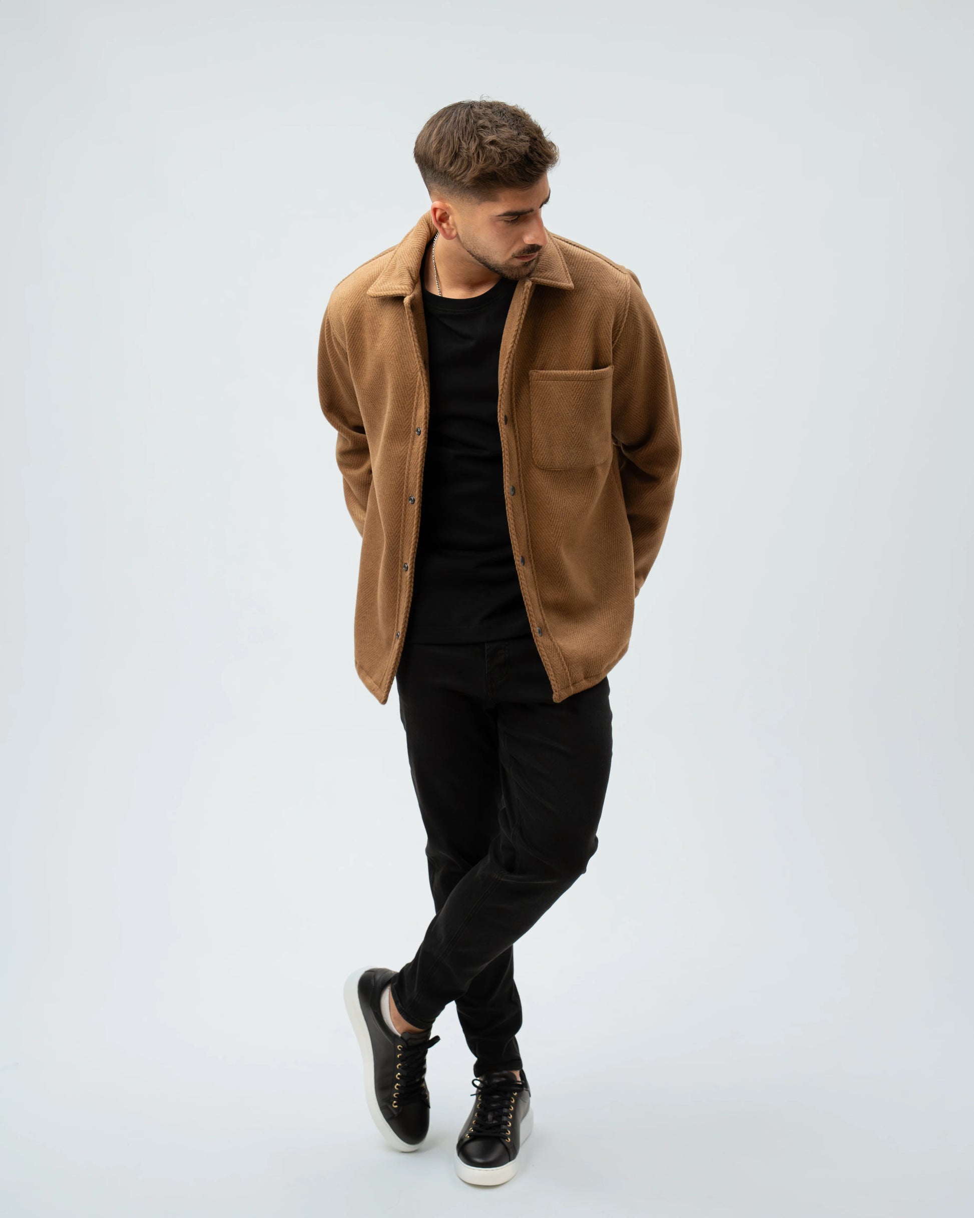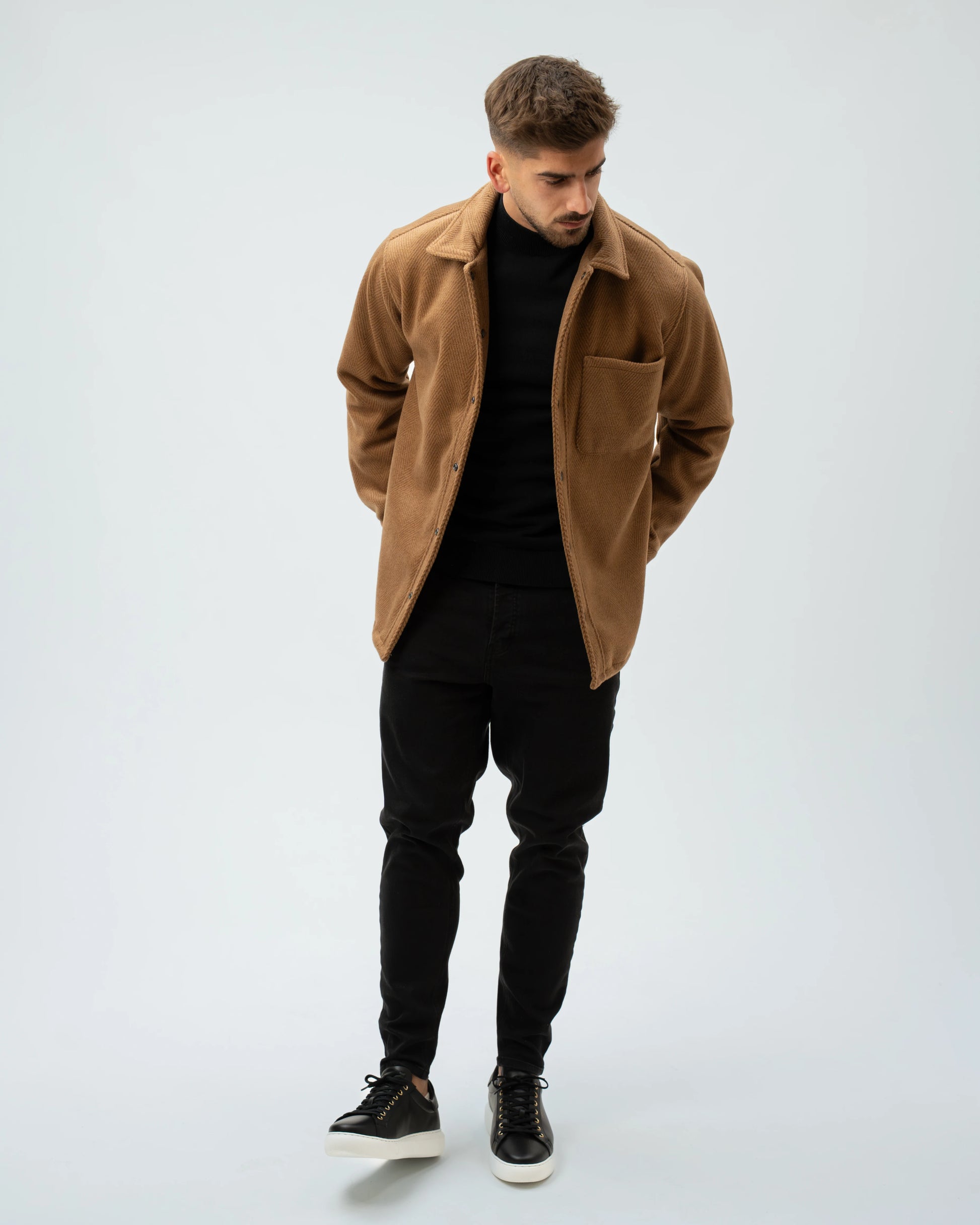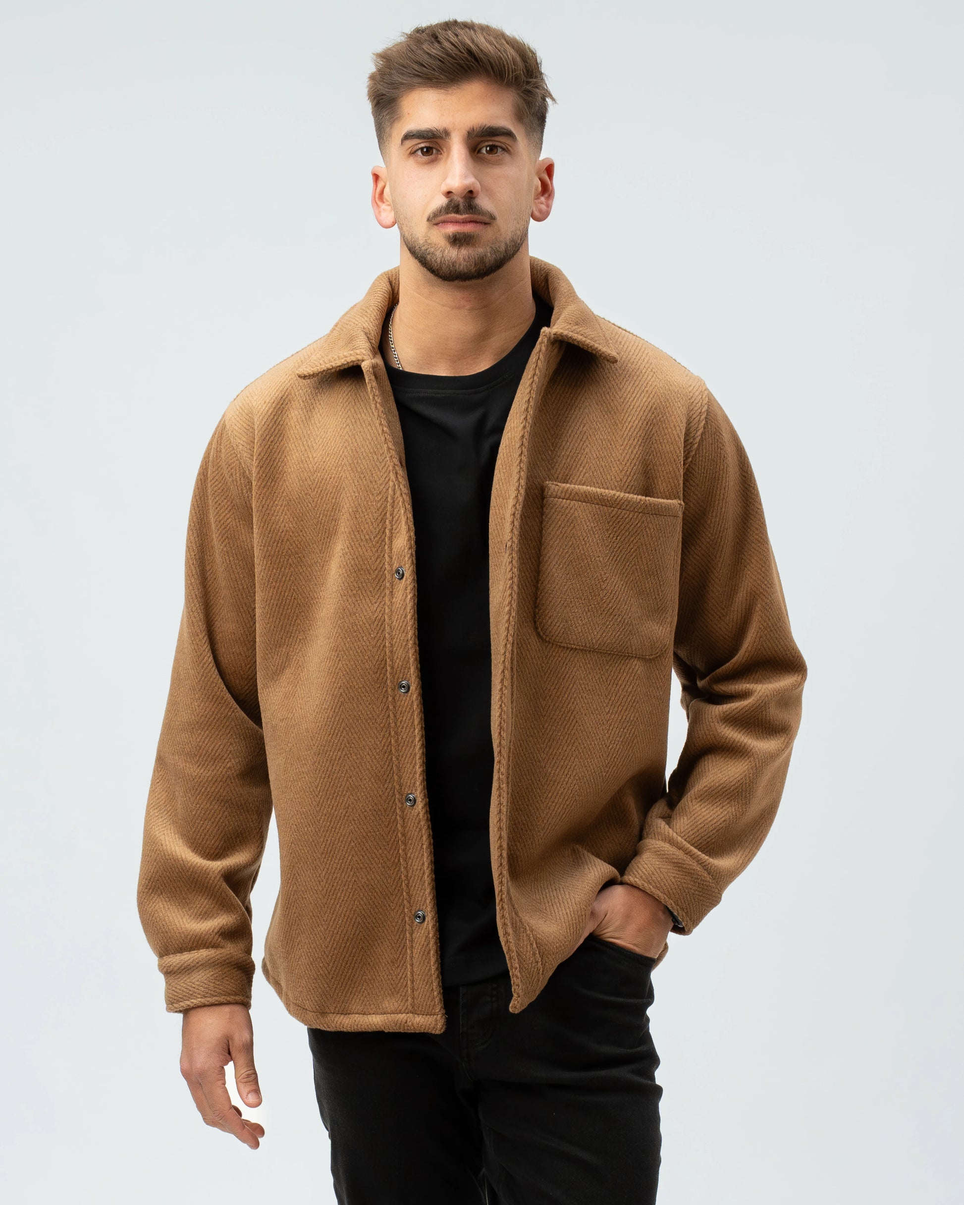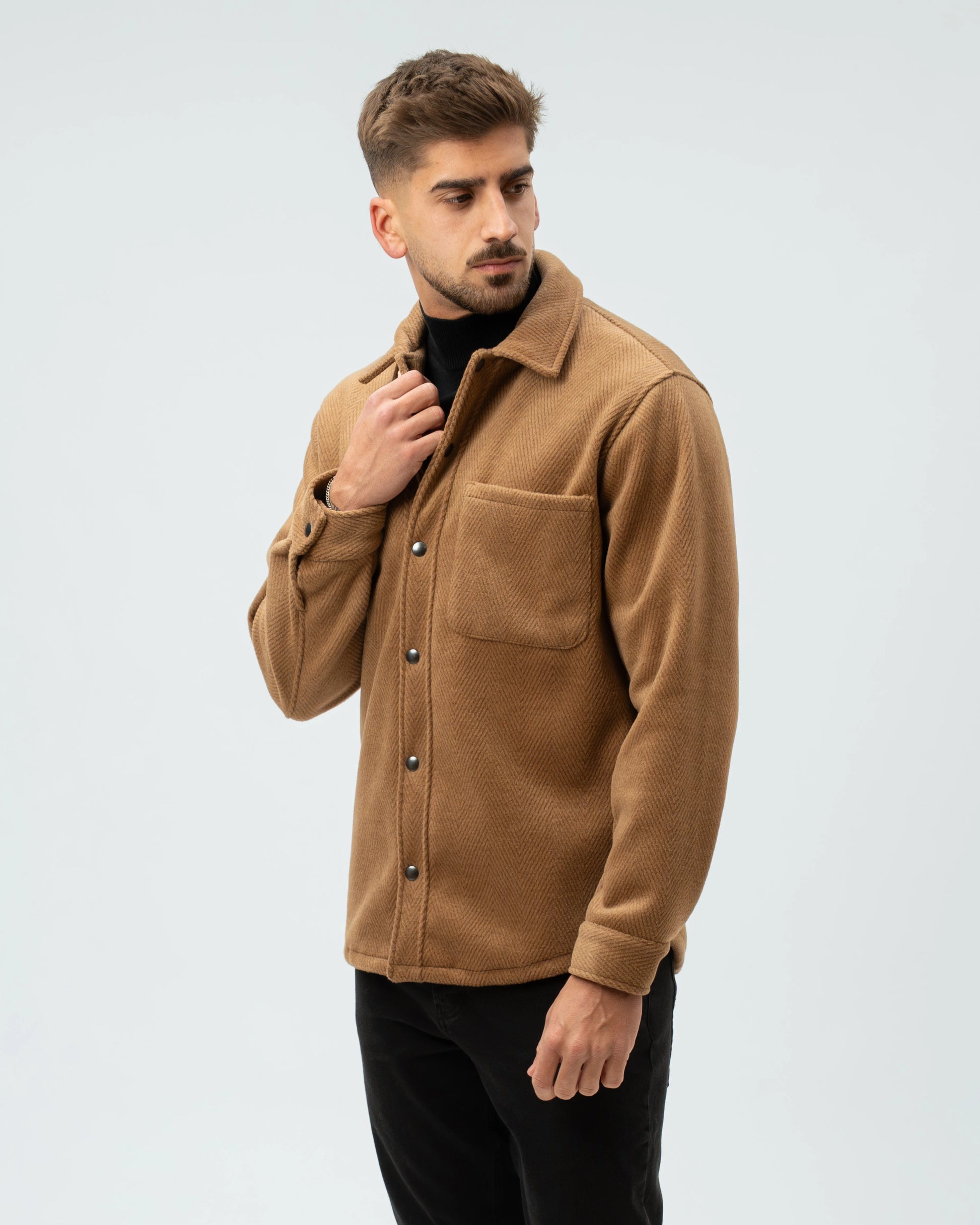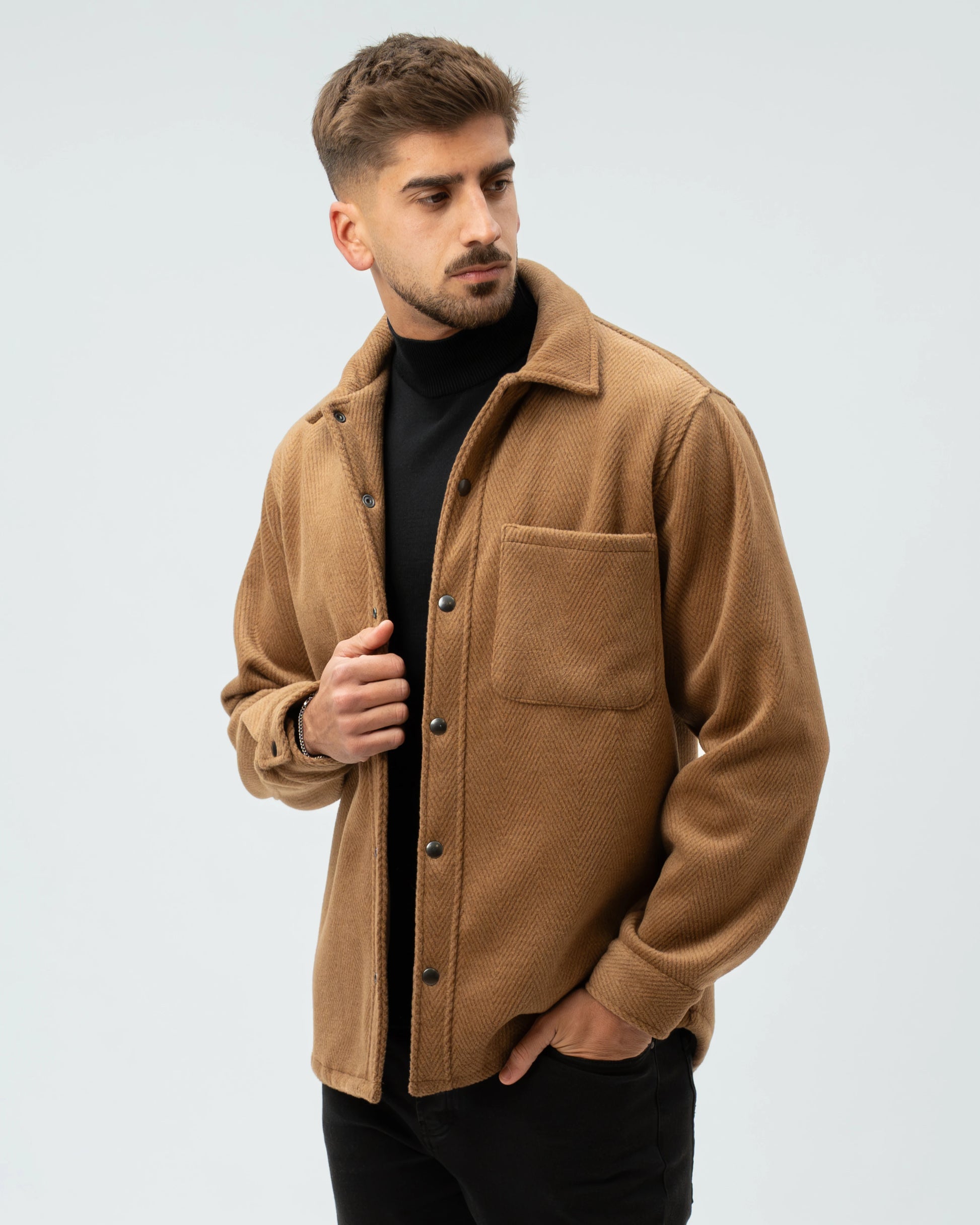 A nossa Overshirt em Lã Batida combina a estrutura de um casaco com o conforto de uma camisa pesada. Com uma textura clássica em padrão Herringbone (espinha), esta peça é o equilíbrio perfeito entre o visual utilitário e o refinamento urbano.
