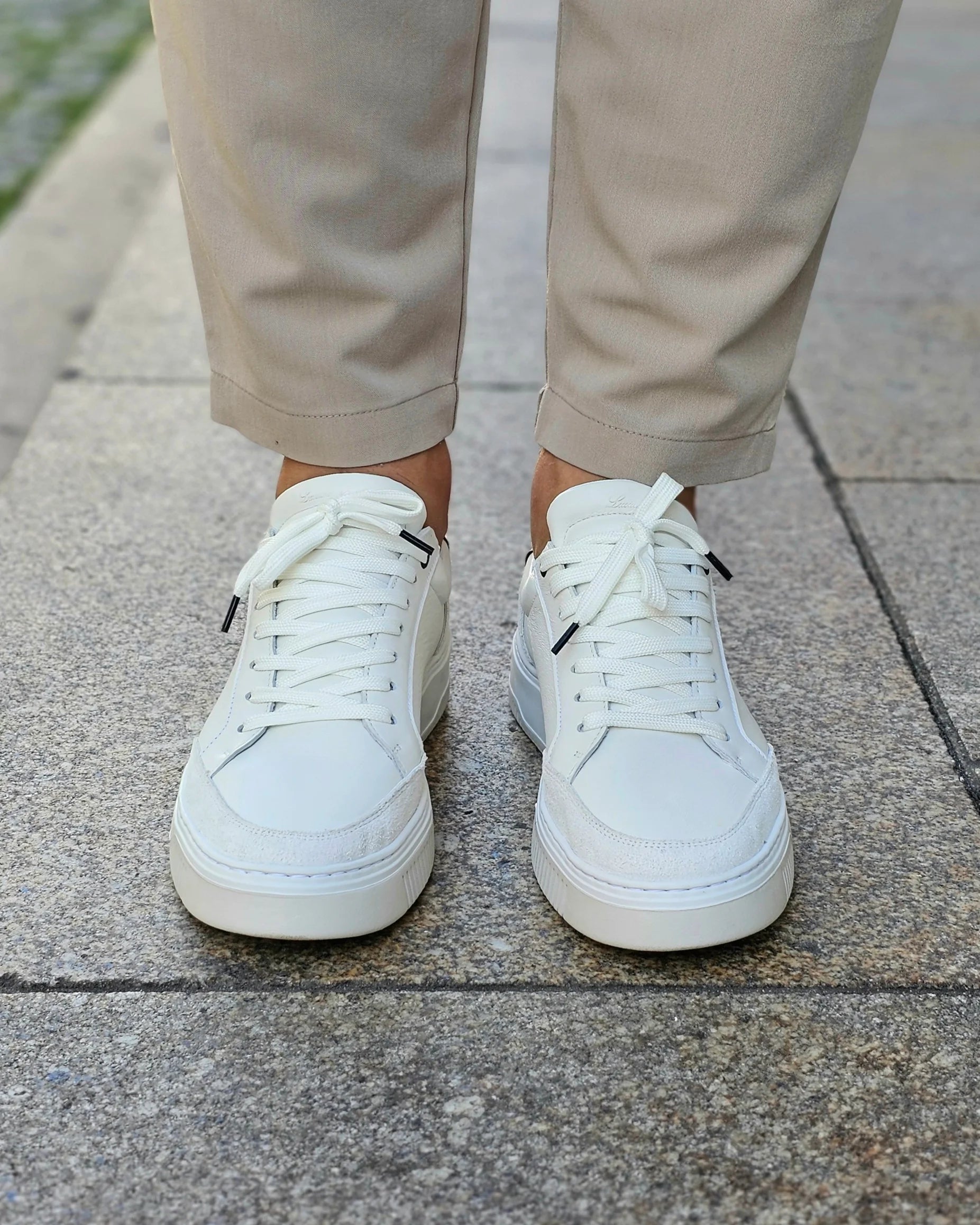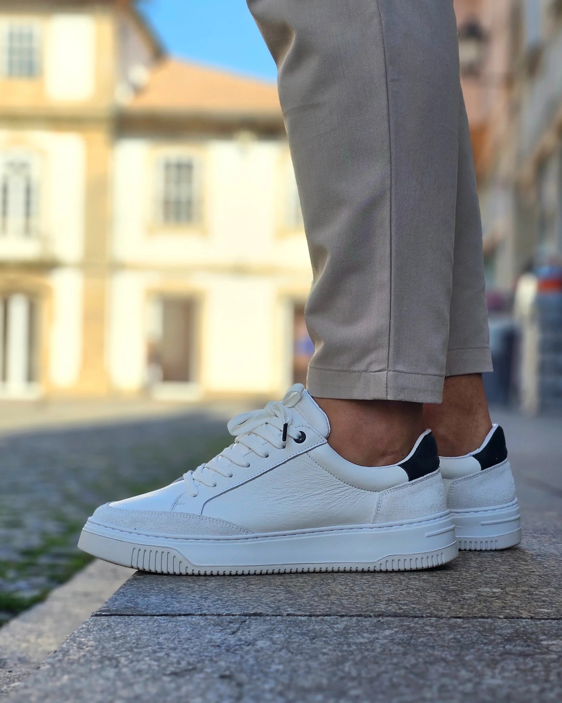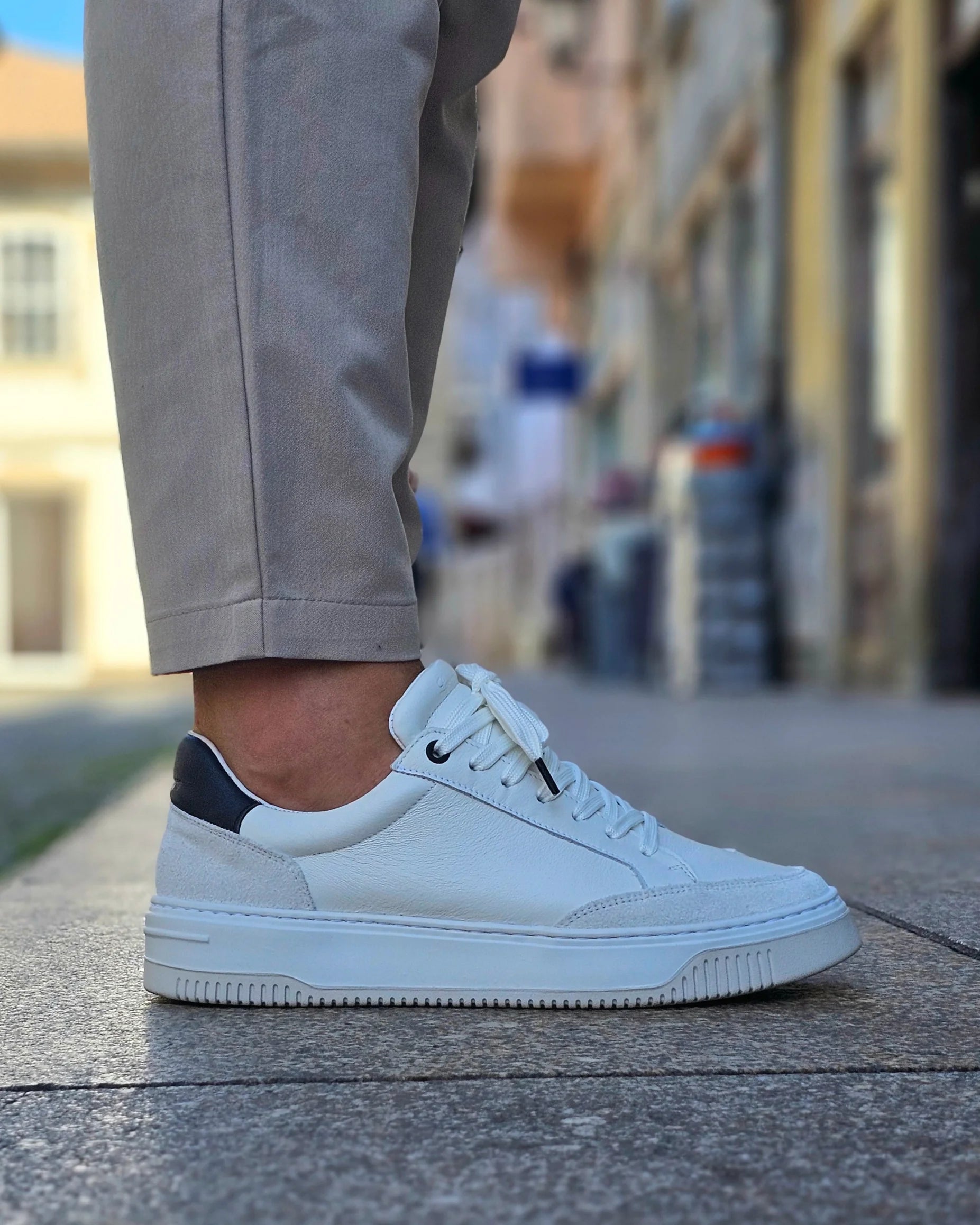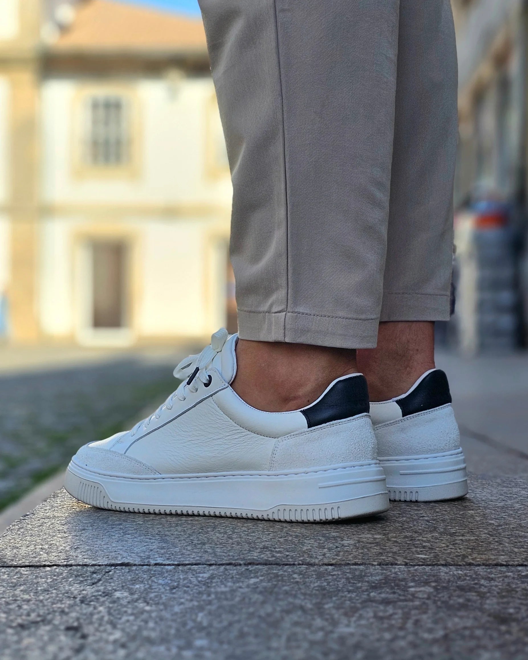 Sapatilha em pele com apontamentos de suede, de sola desportiva. Sapatilha leve, elegante e versátil.